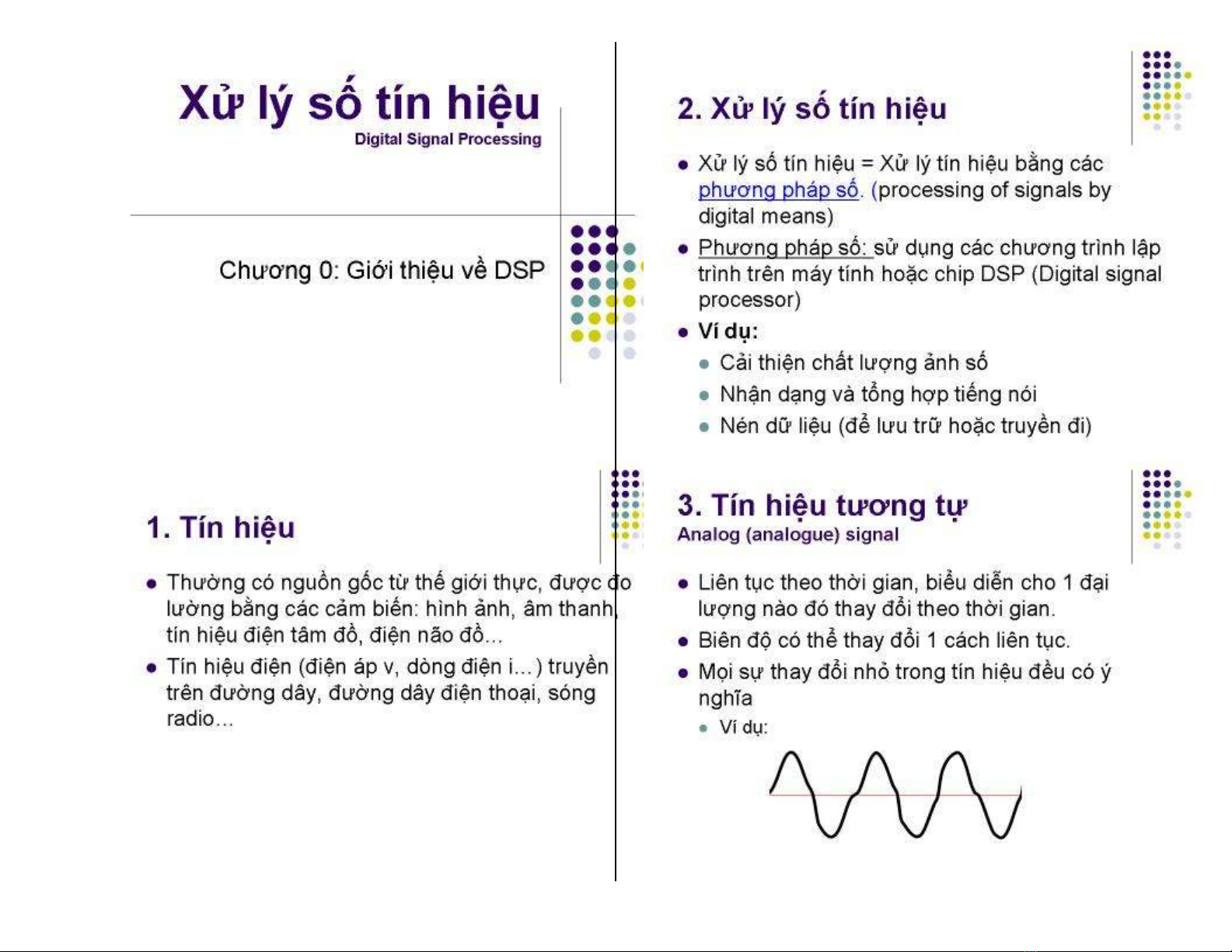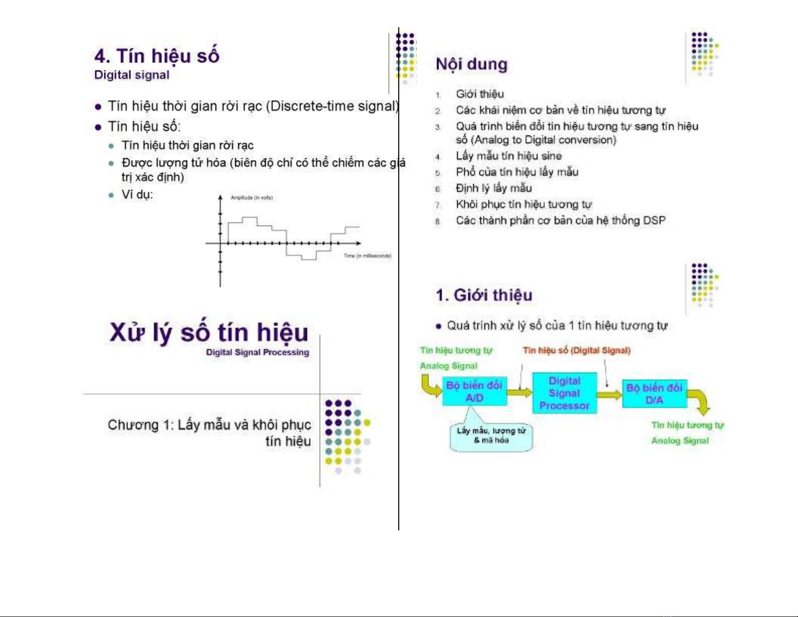 Cùng nắm kiến thức trong bài giảng "Xử lý số tín hiệu" thông qua việc tìm hiểu nội dung các chương sau: chương 0 giới thiệu về DSP, chương 1 lấy mẫu và khôi phục tín hiệu, chương 2 lượng tử hóa, chương 3 các hệ thống thời gian rời rạc, chương 4 lọc FIR và tích chập, chương 5 biến đổi Z, chương 6 các hàm truyền, chương 7 thiết kế bộ lọc số FIR, chương 8 biến đổi DFT và FFT.