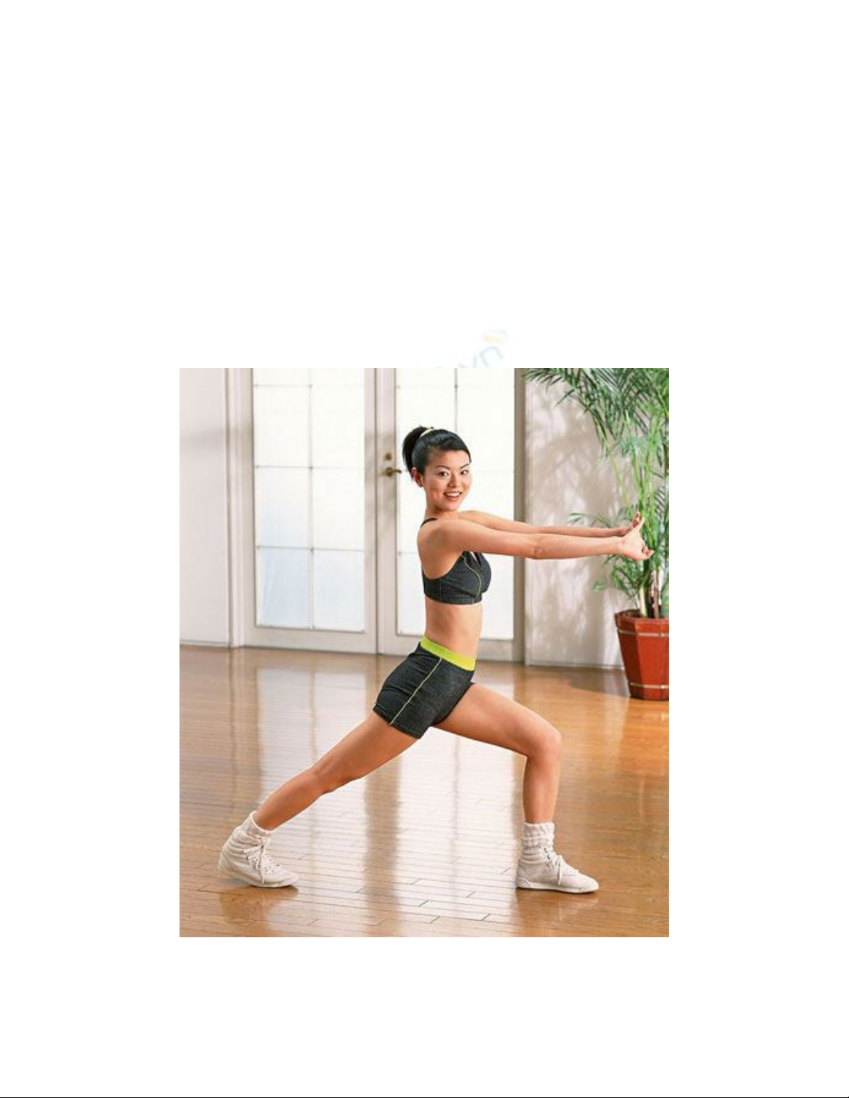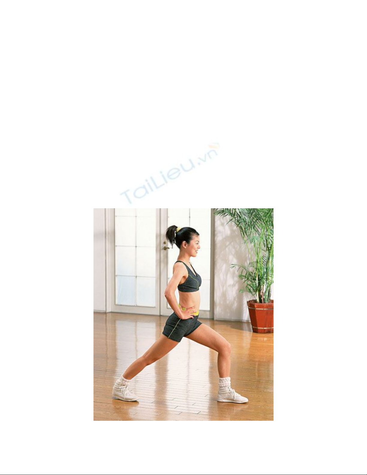 Bước 2: Hít vào, bước chân phải về phía trước, giữ lưng, hông thẳng, khuỵu gối