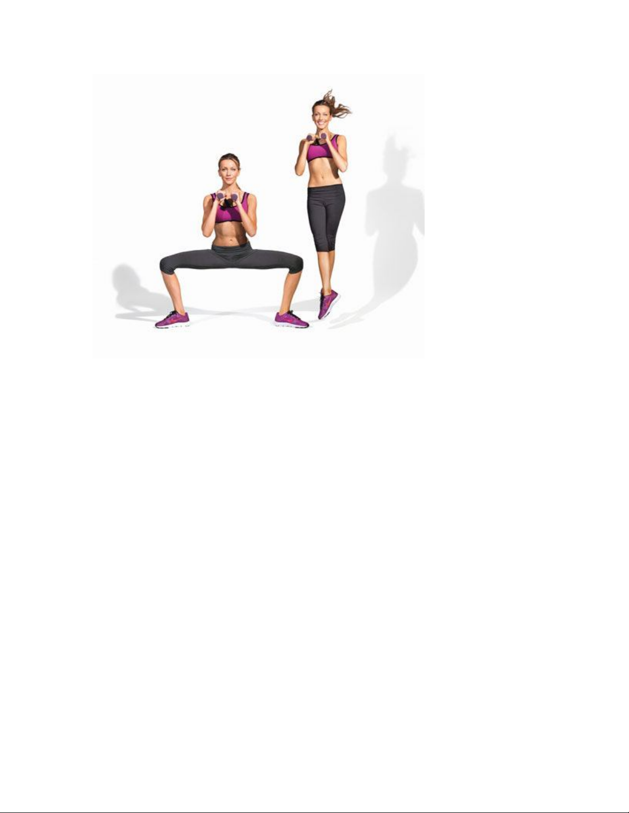 - Đứng ở tư thế mở rộng 2 chân, ngồi xổm, 2 tay cầm 2 quả tạ trước ngực. Bắt đầu