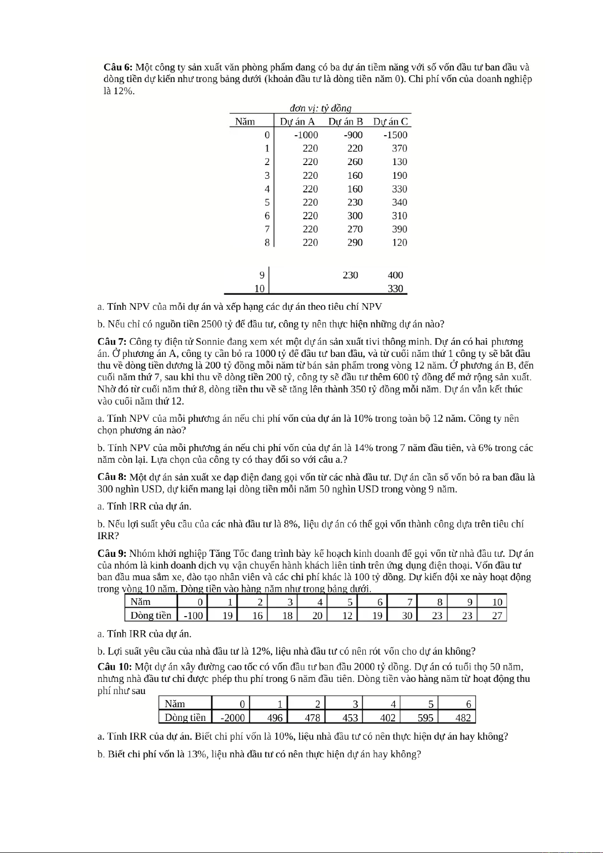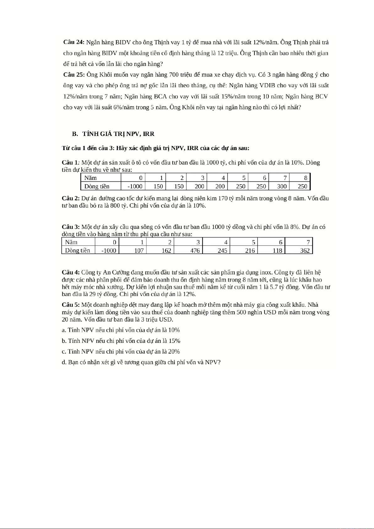 Tài liệu bài tập giá trị thời gian của tiền tệ cung cấp các nội dung kiến thức về: tính giá trị tương lai, hiện tại, NPV, IRR. Ứng dụng trong đầu tư, tài chính cá nhân, so sánh dự án.