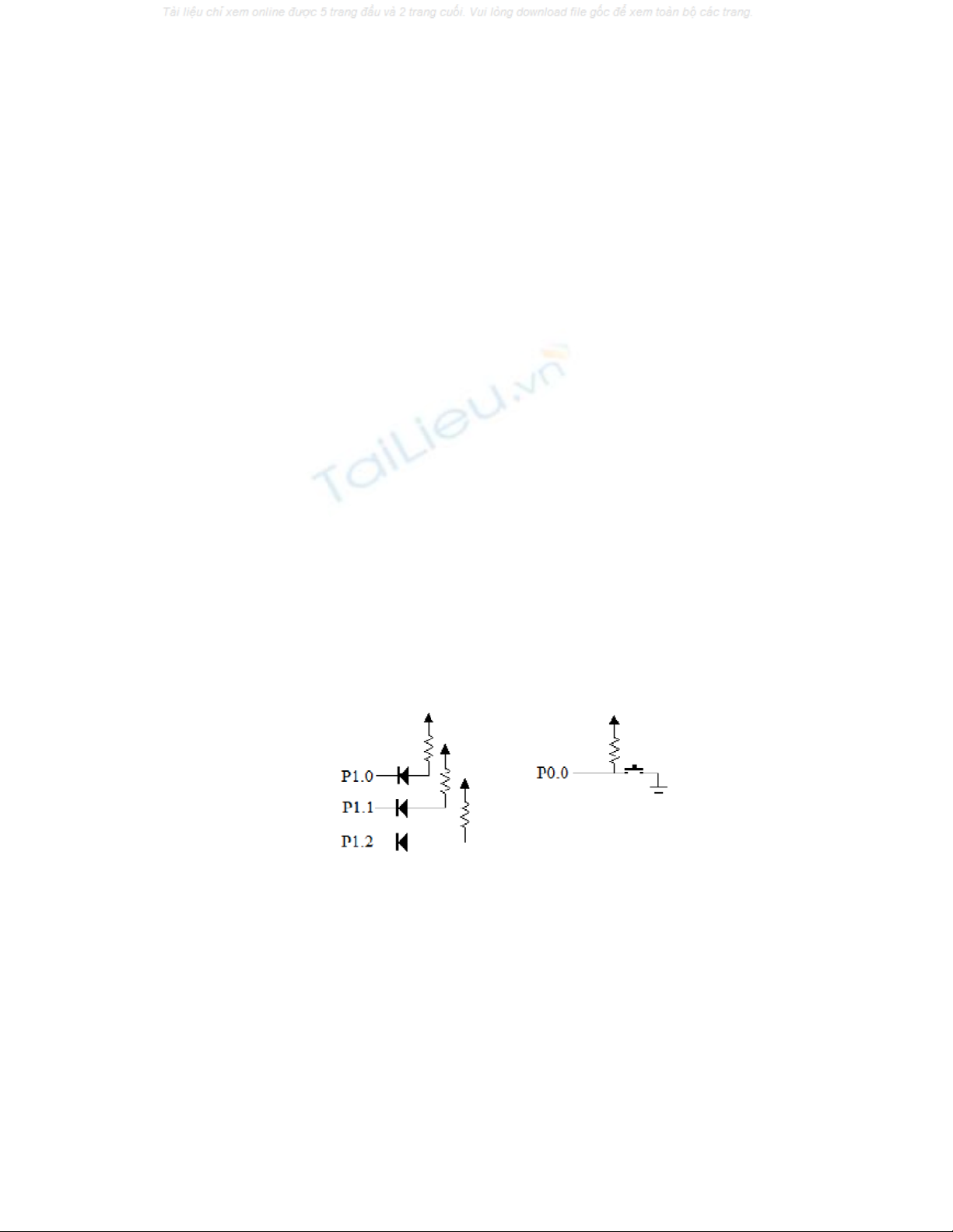 Các LED đươc nối vào P1.0, P1.1 và P1.2, còn công tắc được nối vào P0.0. Giả sử điện trở kéo lên ở P0.0