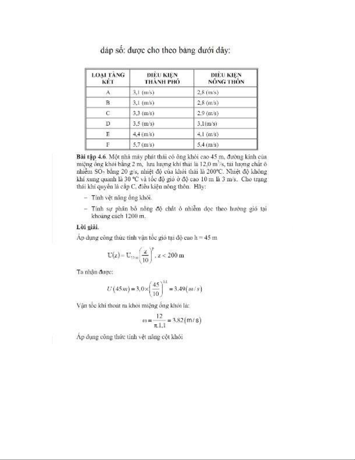 Trạm khí tượng tại gần khu công nghiệp thực hiện quan trắc vận tốc gió tại độ cao 10m. Biết rằng vận tốc gió quan trắc dduwwocj bằng 2,5 m/s. Hãy tính vận tốc gió tại độ cao 4om theo các điều kiện ổn định khác nhau trong điều kiện nông thôn và thành thị.