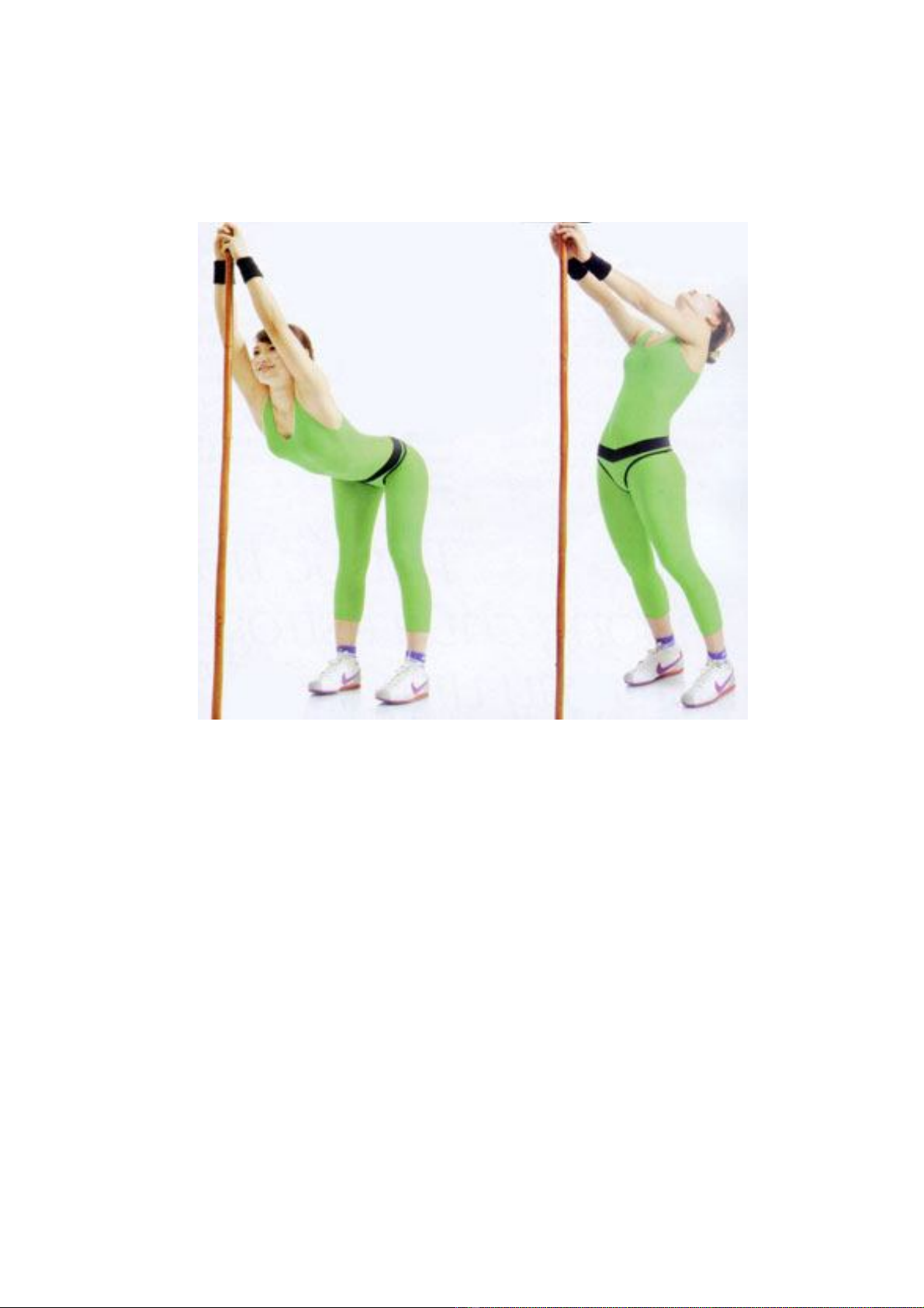 gậy, đưa cao quá đầu. Vươn cao người, hít vào thật sâu, từ từ gập người về phía trước,