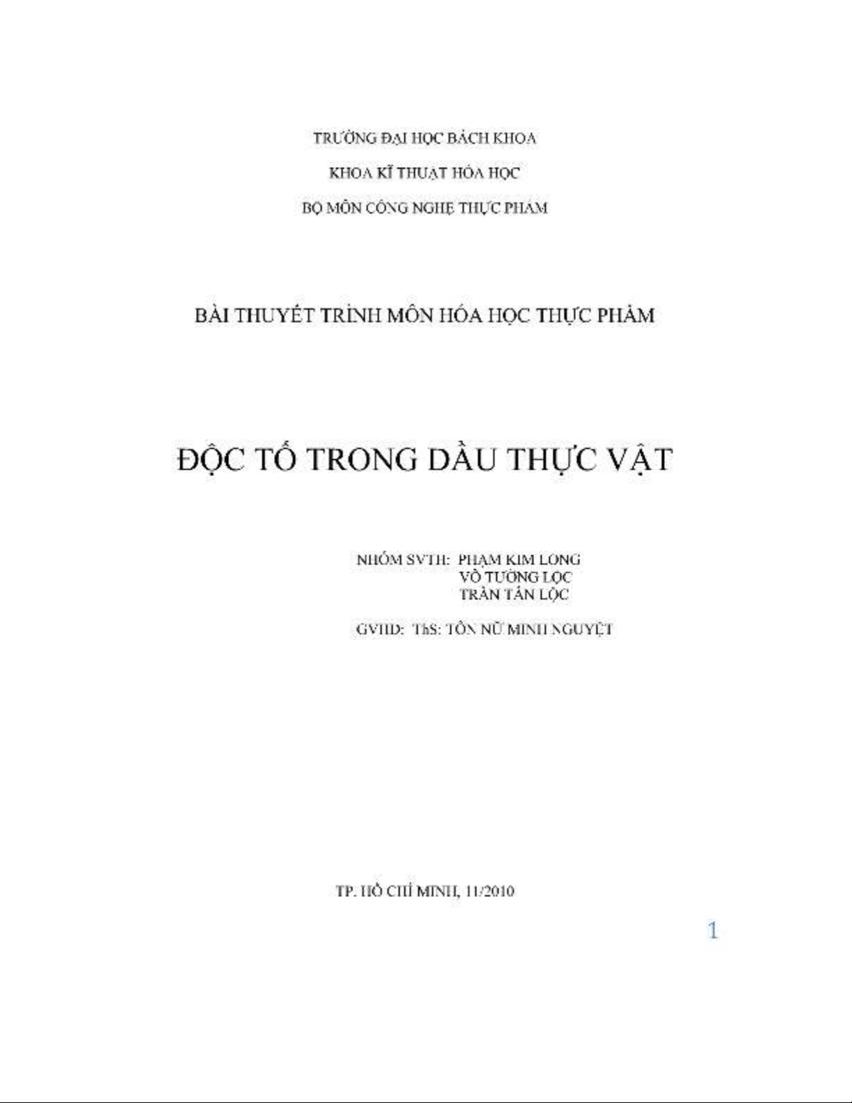 Bài thuyết trình Hóa học thực phẩm: Độc tố trong dầu thực vật bao gồm những nội dung về định nghĩa, phân loại, đặc điểm cấu tạo và tính chất của dầu thực vật; độc tố trong dầu thực vật có nguồn gốc từ nguyên liệu, độc tố hình thành trong quá trình bảo quản và chế biến.