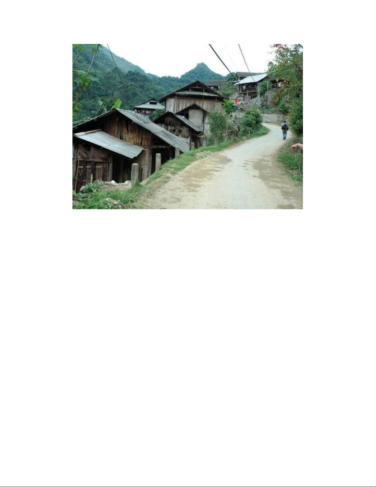 Một vài ngôi nhà sàn thấp thoáng sau những rặng cây xa xa, mái ngói thâm đen và lẫn