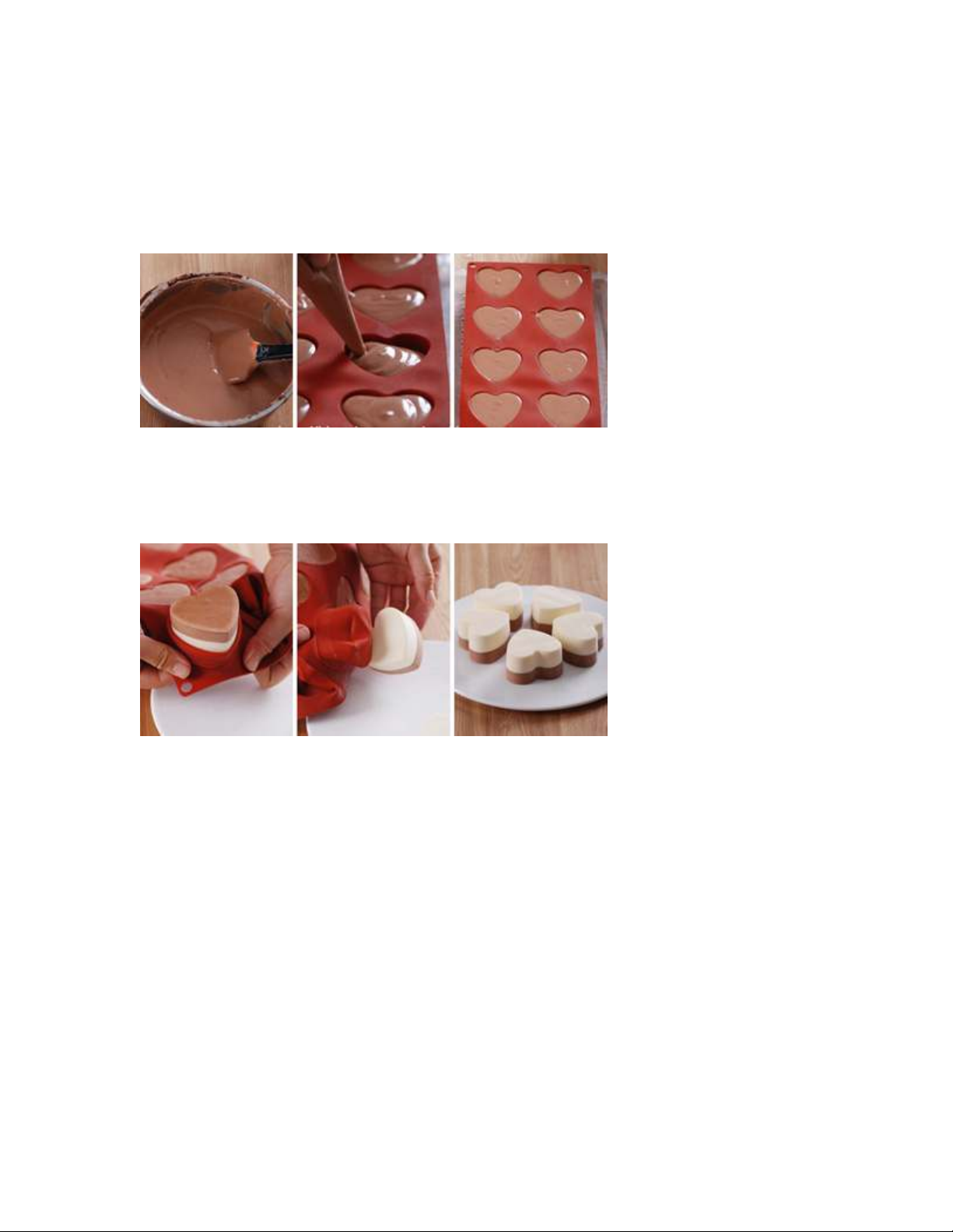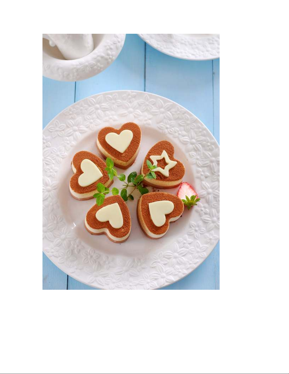 Rắc bột ca cao lên mặt bánh rùi trang trí bằng sôcôla trắng hình trái tim.