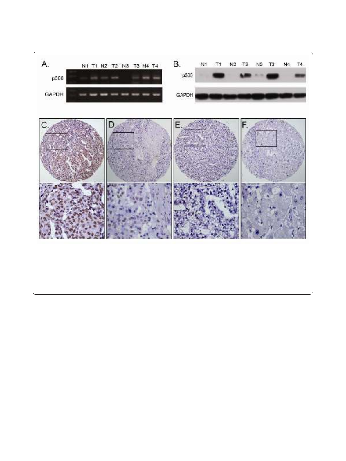 Figure 2 The mRNA and protein expression of p300 in HCC and adjacent non-malignant liver tissues. A. Up-regulated expression of p300