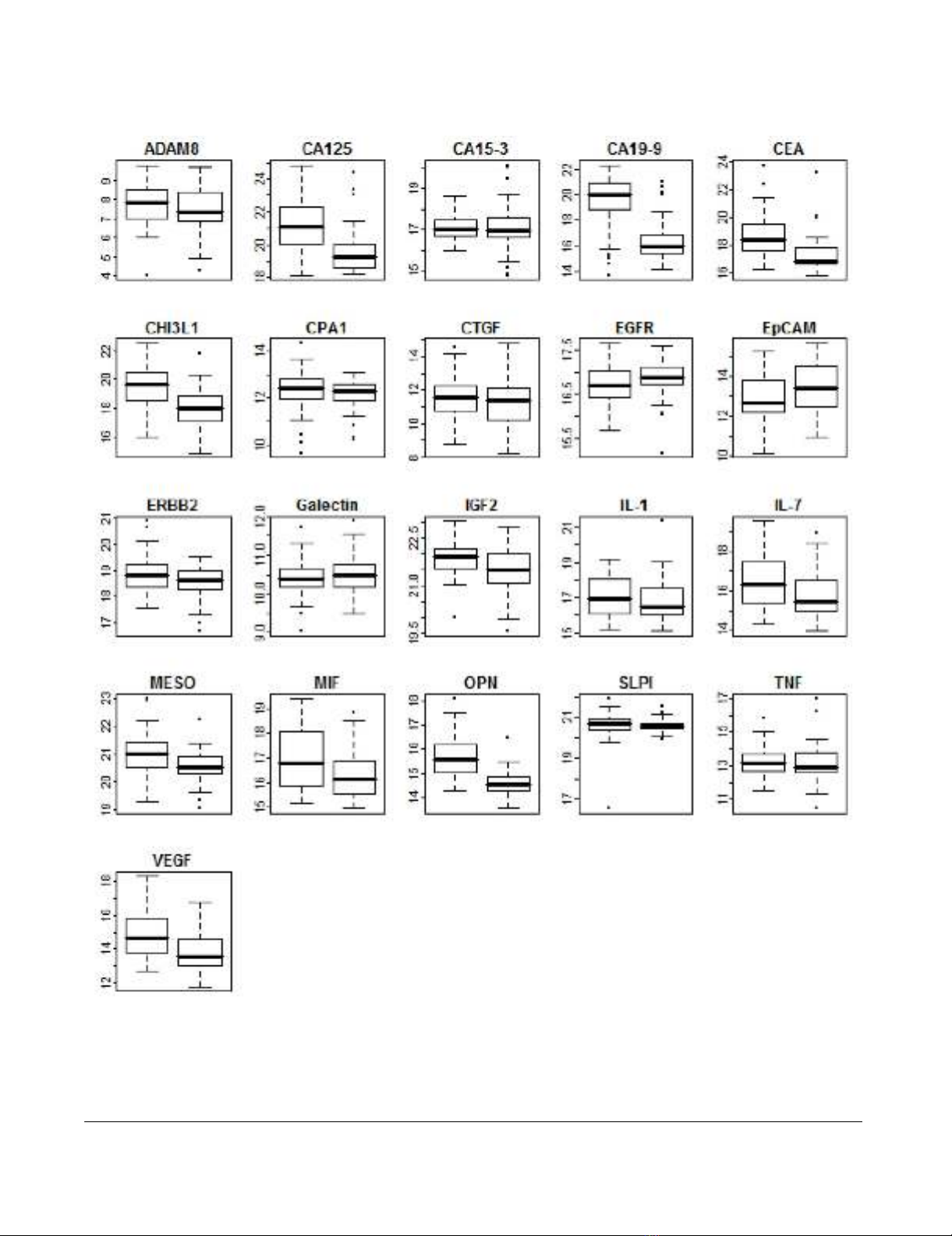 ligation assay. Each boxplot corresponds to a single tumor marker measured in 95 samples by proximity ligation assay. Pan-