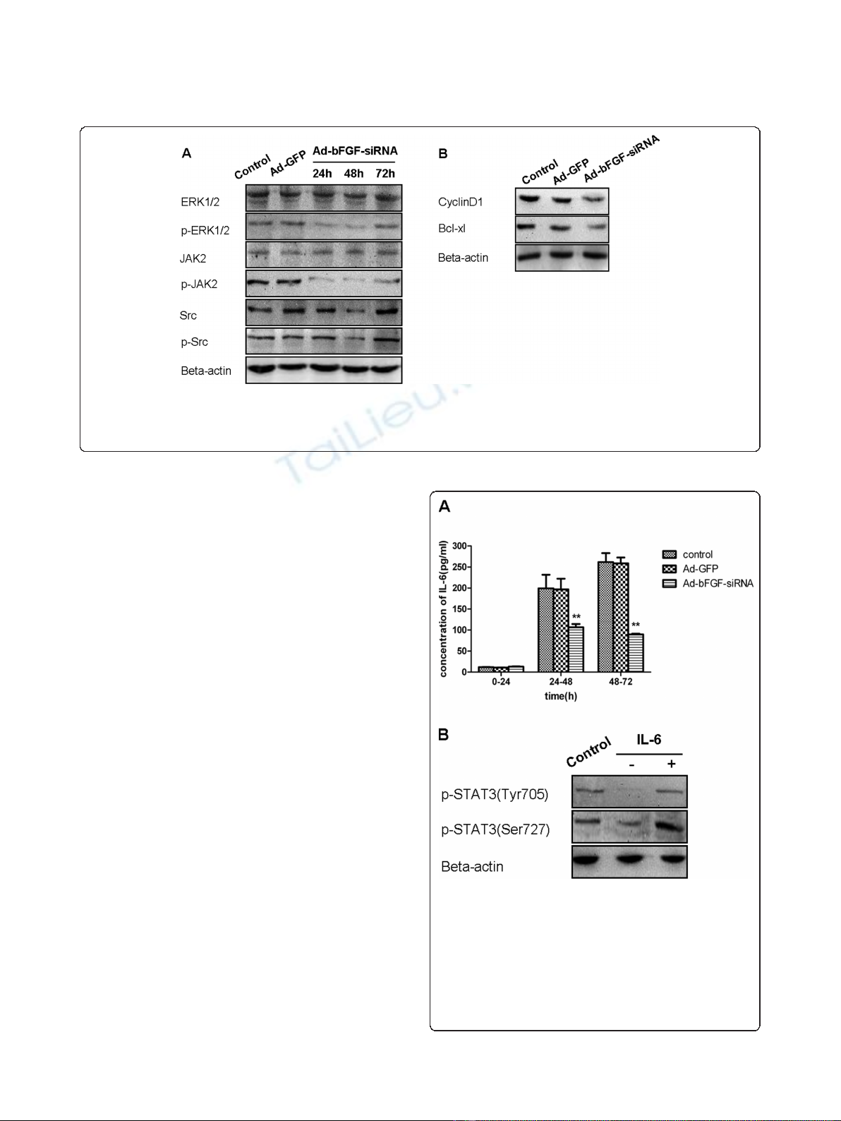 cells. Total ERK1/2 and JAK2 expression remains stable. Total and phosphorylated Src decreases at 48 h in a similar manner. (B) Ad-bFGF-siRNA