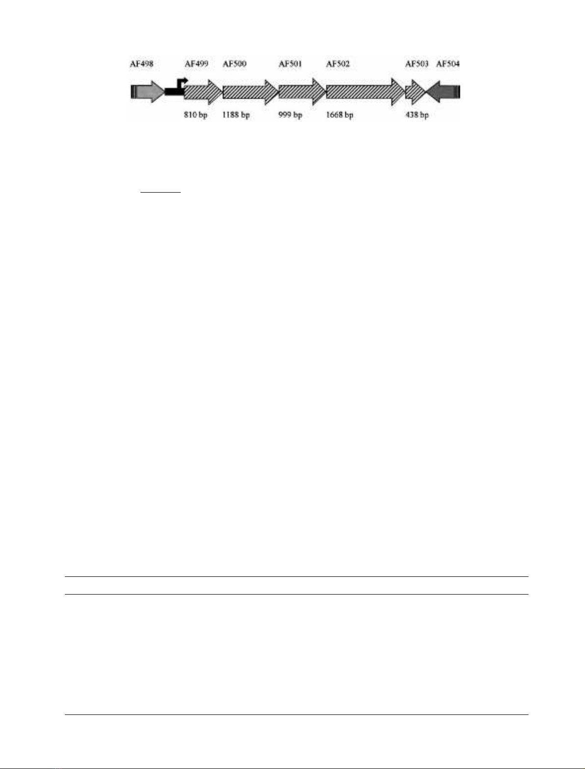 above the arrow representing the genes and their direction of transcription. The size in bp is given below each gene. Between the genes AF498 and