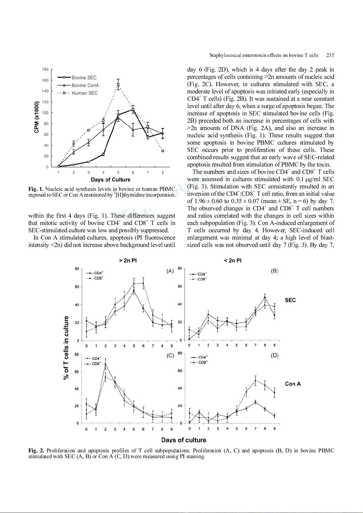 T cell in SEC (B, D) or Con A (C, E) stimulated bovine PBMC cultures on day 4