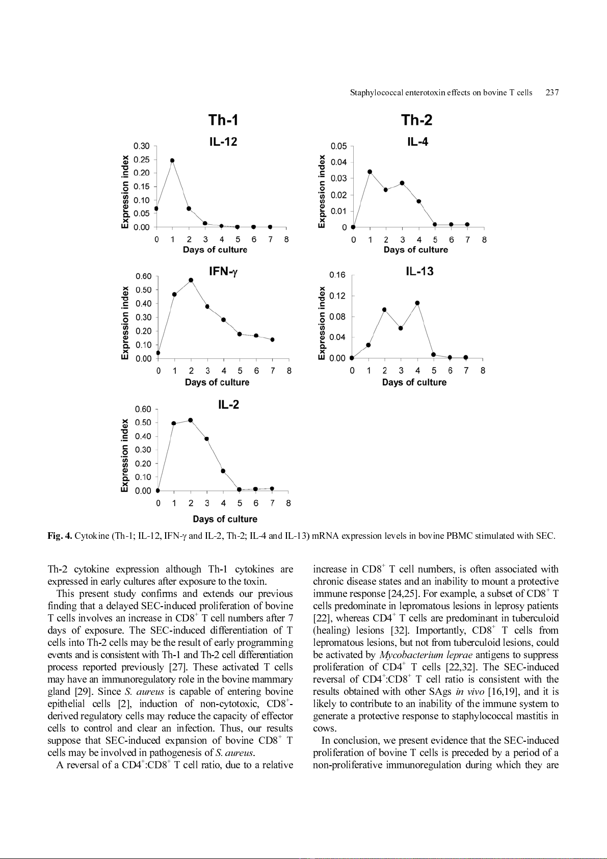 and IL-2, Th-2; IL-4 and IL-13) mRNA expression levels in bovine PBMC stimulated with SEC.