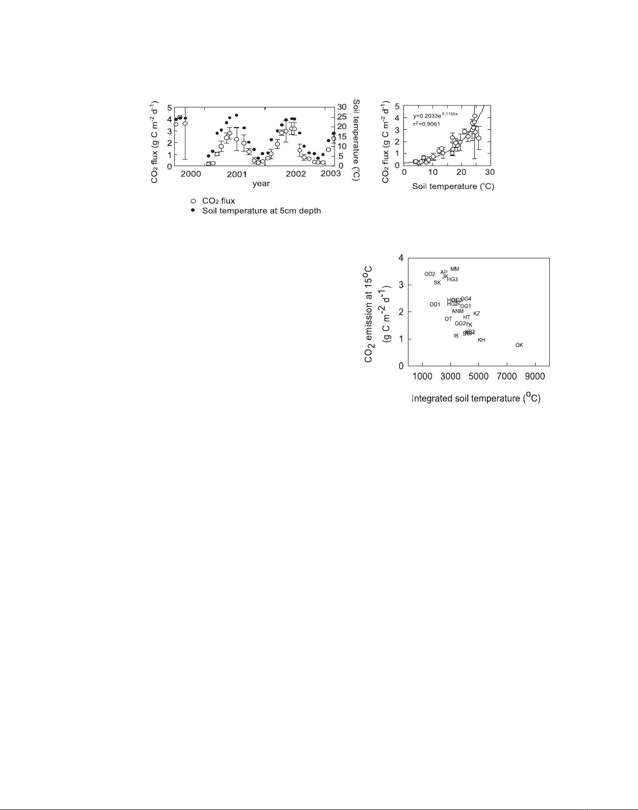 Seasonal fluctuation in CO2flux was found to correlate exponentially with seasonal fluctuation in soil temperature at each site. Estimate of annual