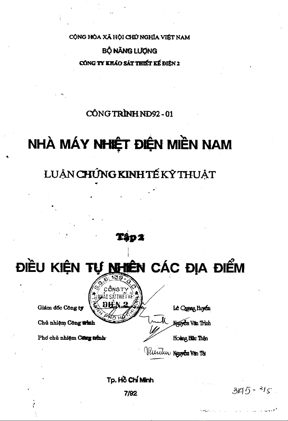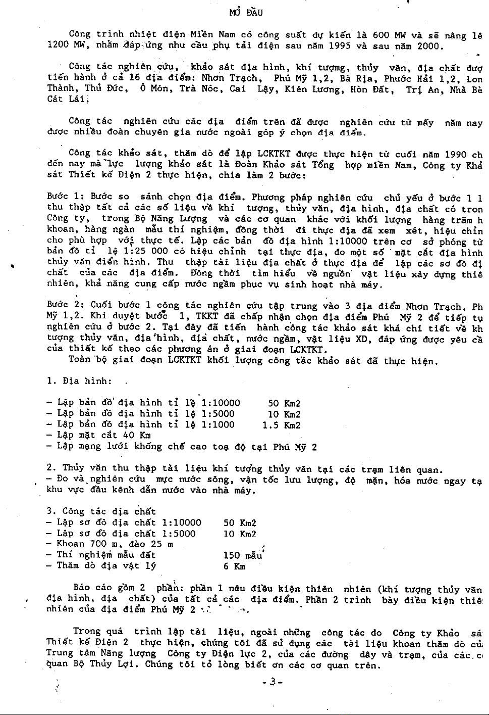 Công trình nhiệt điện Miền Nam có công suất sự kiến l 600 MW và sẽ nâng lên 1200 MW, nhằm đáp ứng nhu cầu phụ tải điện sau 1995 và sau năm 2000. Công tác nghiên cứu khảo sát địa hình, khí tượng, thủy văn, địa chất được tiến hành cả 16 địa điểm. Công tác nghiên cứu các địa điểm đã được nghiên cứu từ mấy năm nay được nhiều đoàn chuyên gia nước ngoài góp ý chọn địa điểm