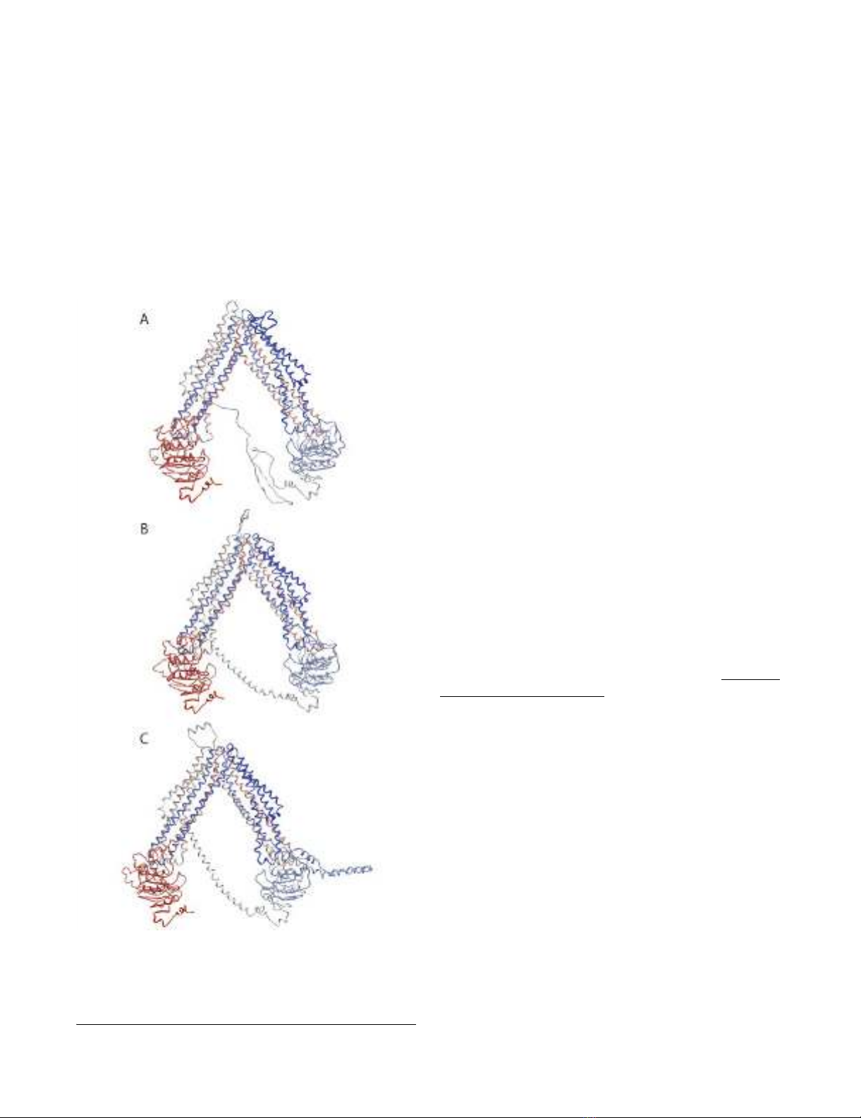 Backbone Cα-traces of ABCB1 model (A), ABCC4 model (B) and ABCC5 model (C) viewed in the membrane plane, cytoplasm downwardsFigure 3