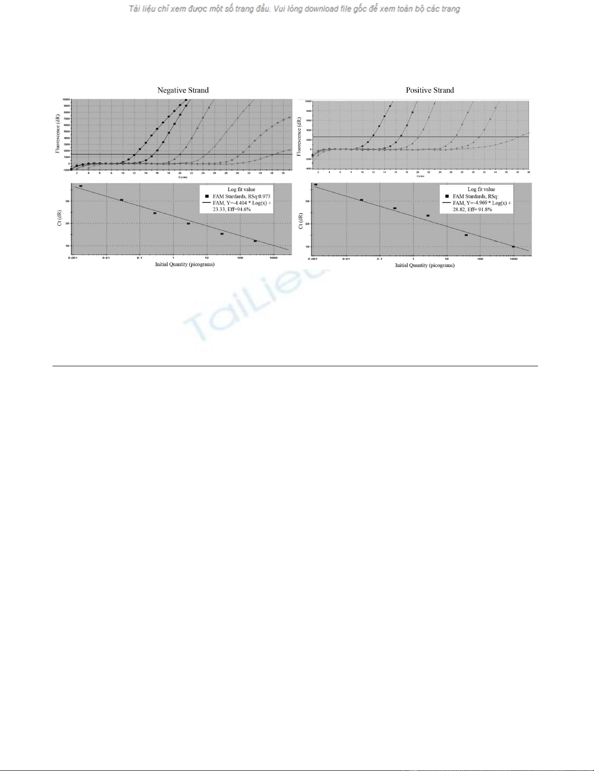 the observed CT value (Y axis) against the initial quantities of 10-fold serial diluted RNA. CT values are the average of three rep-