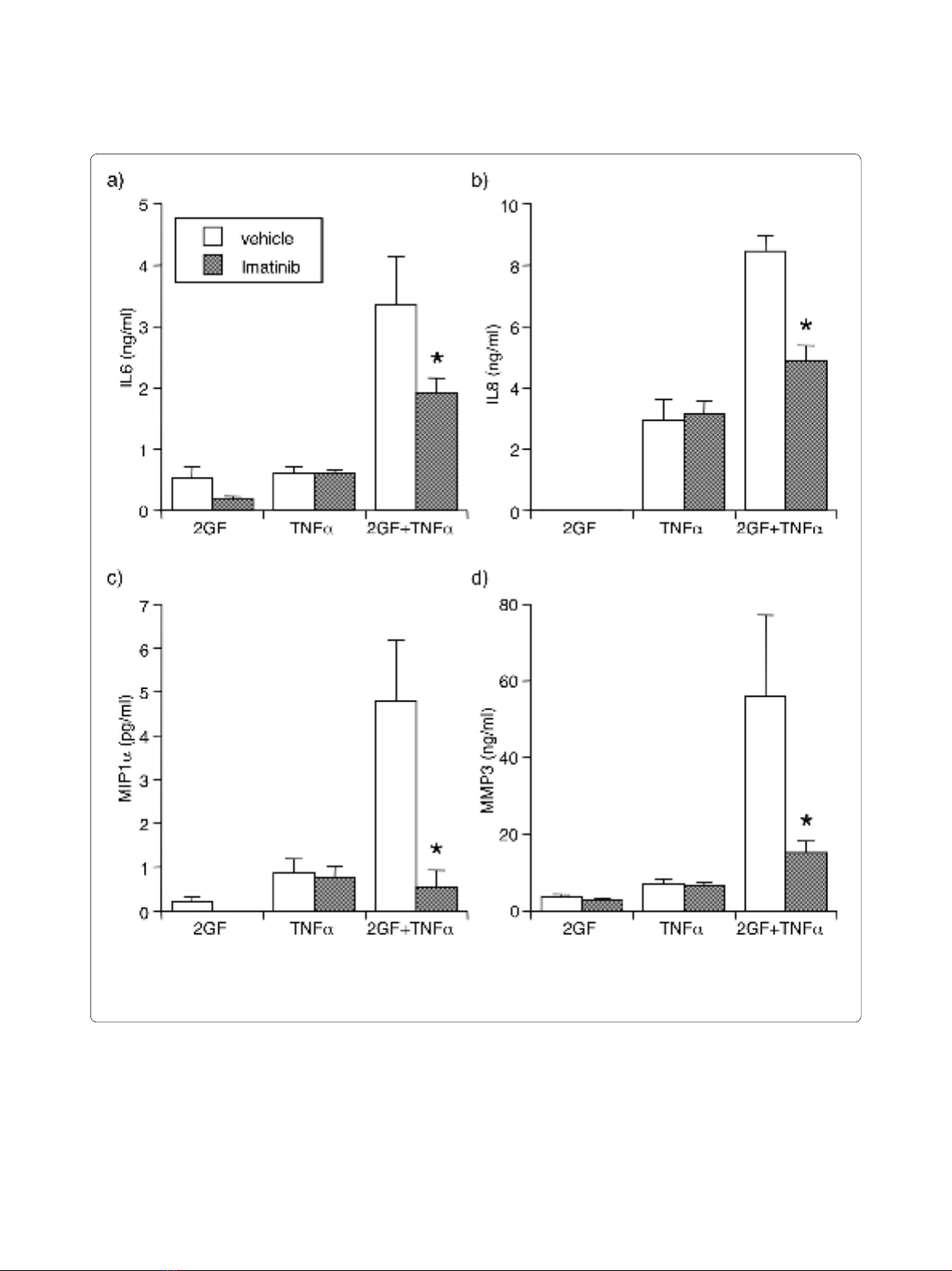 Figure 3 Reversal by imatinib (1 μM) of 2GF potentiation of TNFα-induced (a) IL6, (b) IL8, (c) MIP1α, and (d) MMP3 secretion. For culture con-