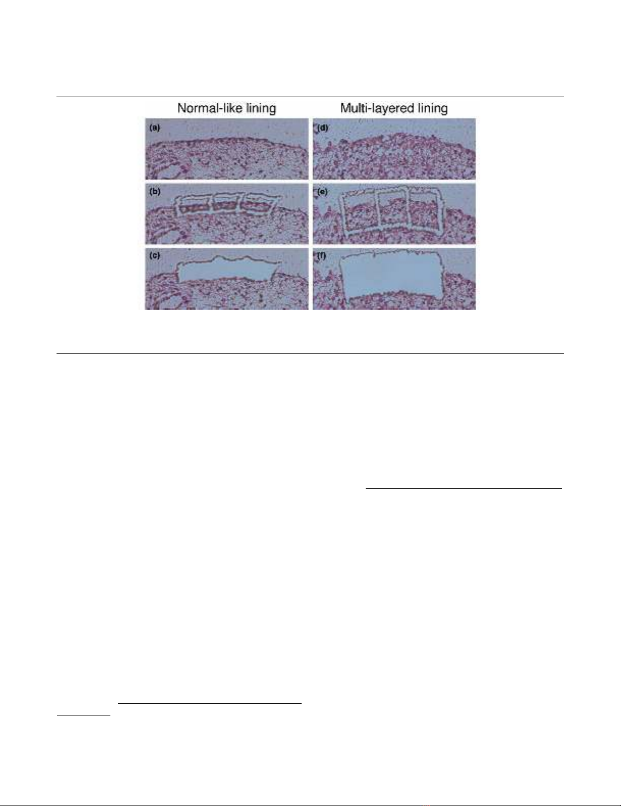 Laser capture microdissection of synovial lining regions with normal-like lining or multilayered liningLaser capture microdissection of synovial lining regions with normal-like lining or multilayered lining. (a,d)before microdissection; (b,e) after