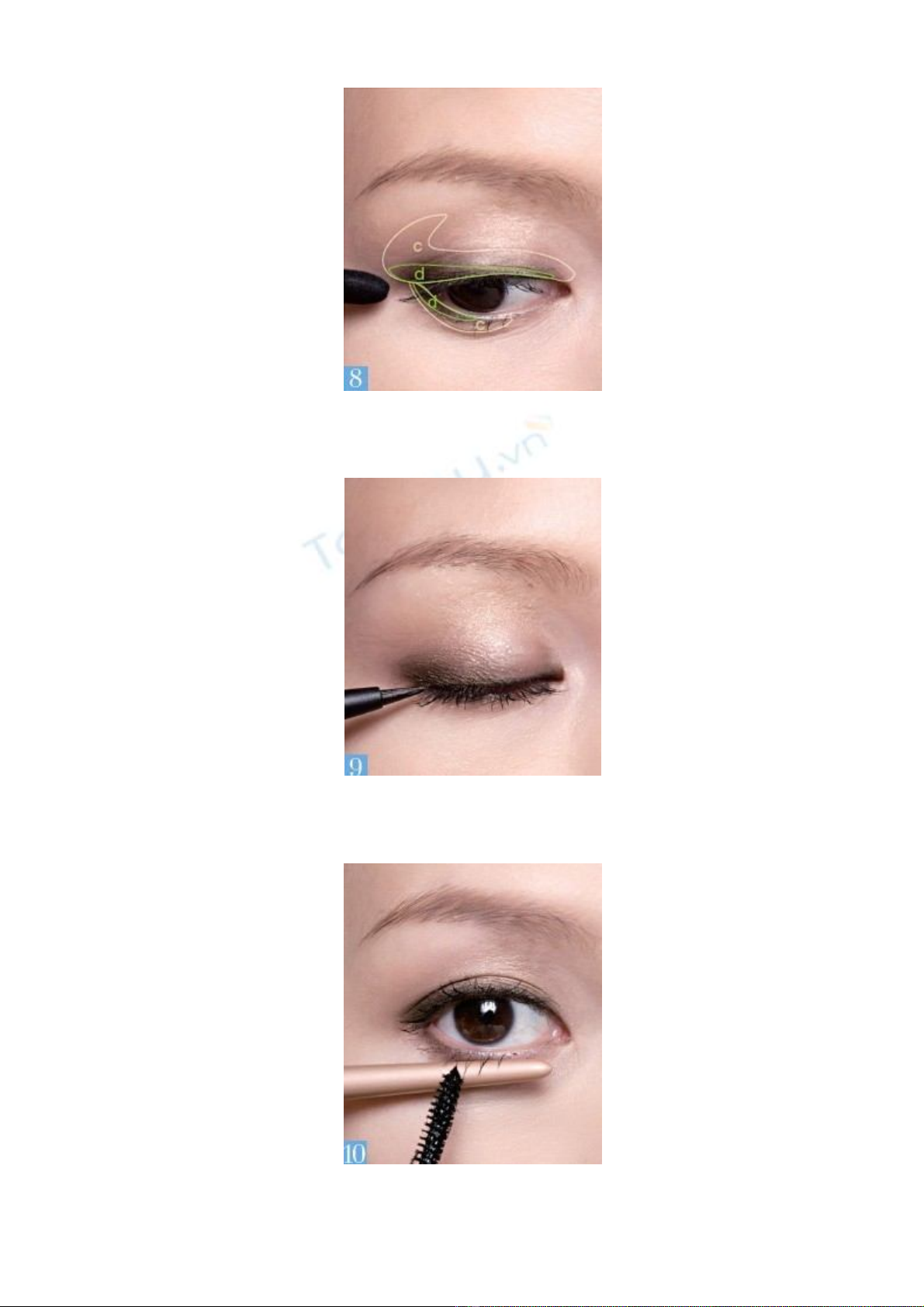 - Chia mi thành 3 đoạn kẹp cong, mi trên chuốt từ chân lên, mi dưới dùng đoạn cuối của