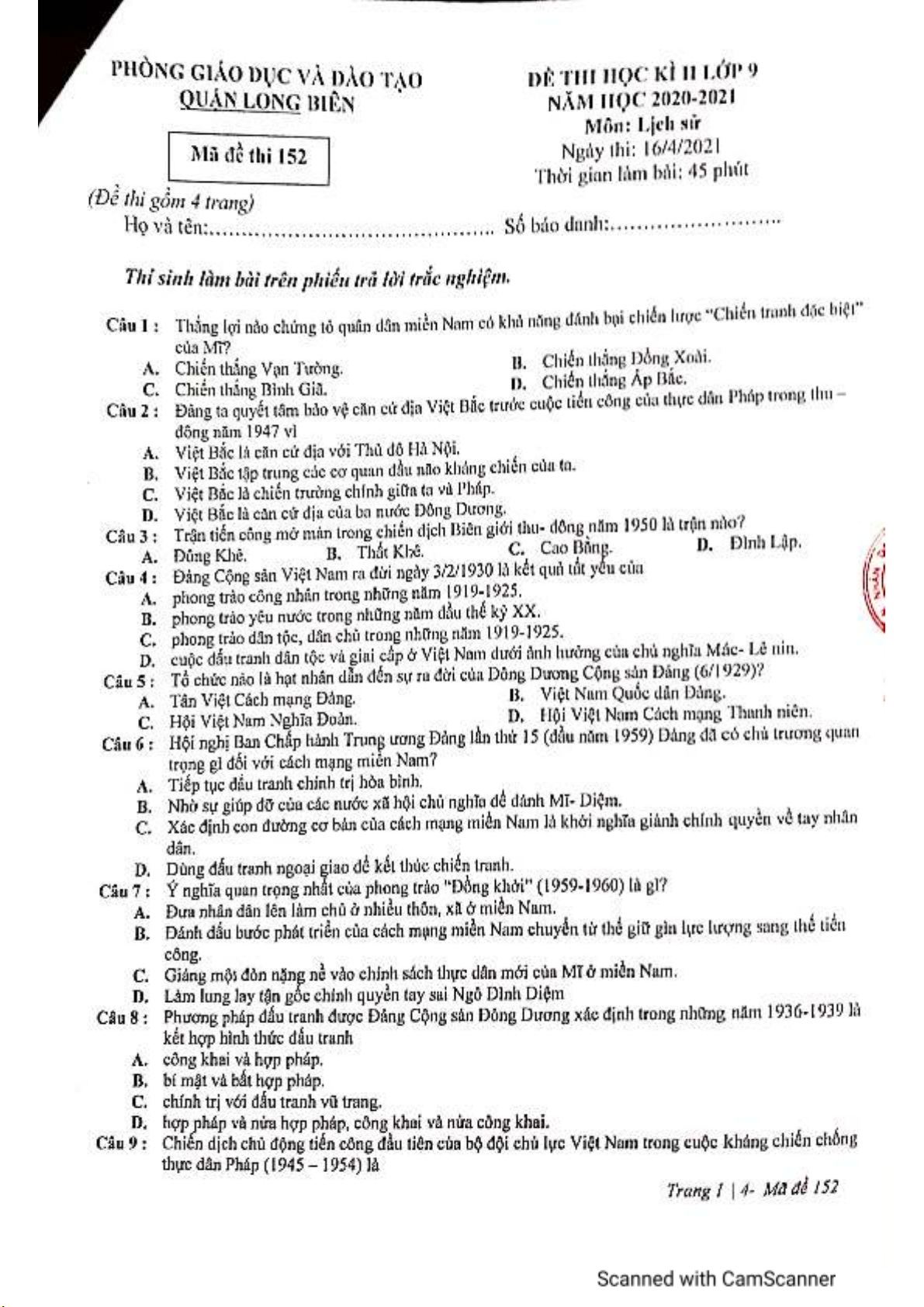 2. Đề thi học kì 2 môn Lịch sử lớp 9 năm 2020-2021 có đáp án - Phòng