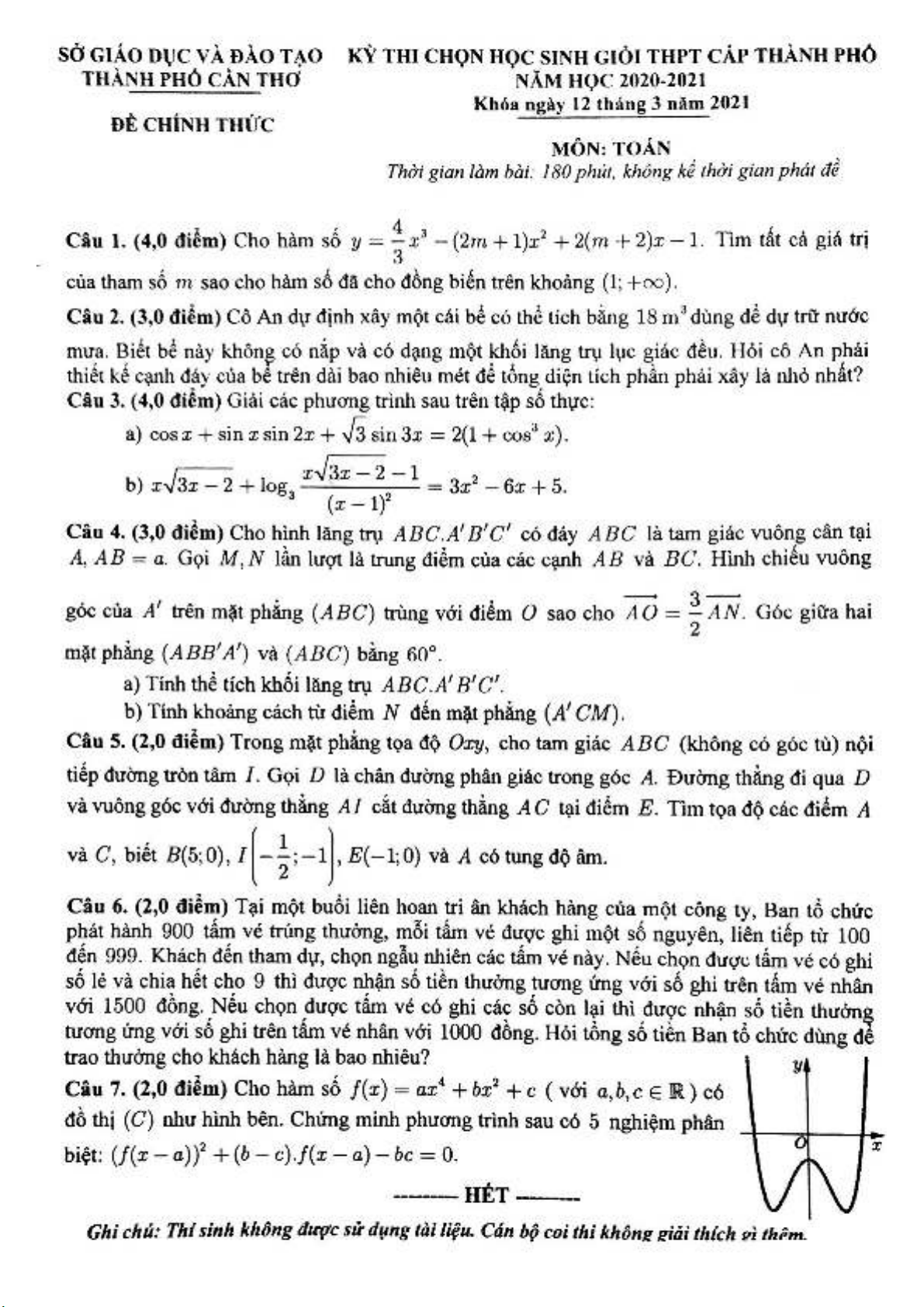 1. Đề thi học sinh giỏi môn Toán lớp 12 cấp Thành phố năm 2020-2021 - Sở GD&ĐT Cần