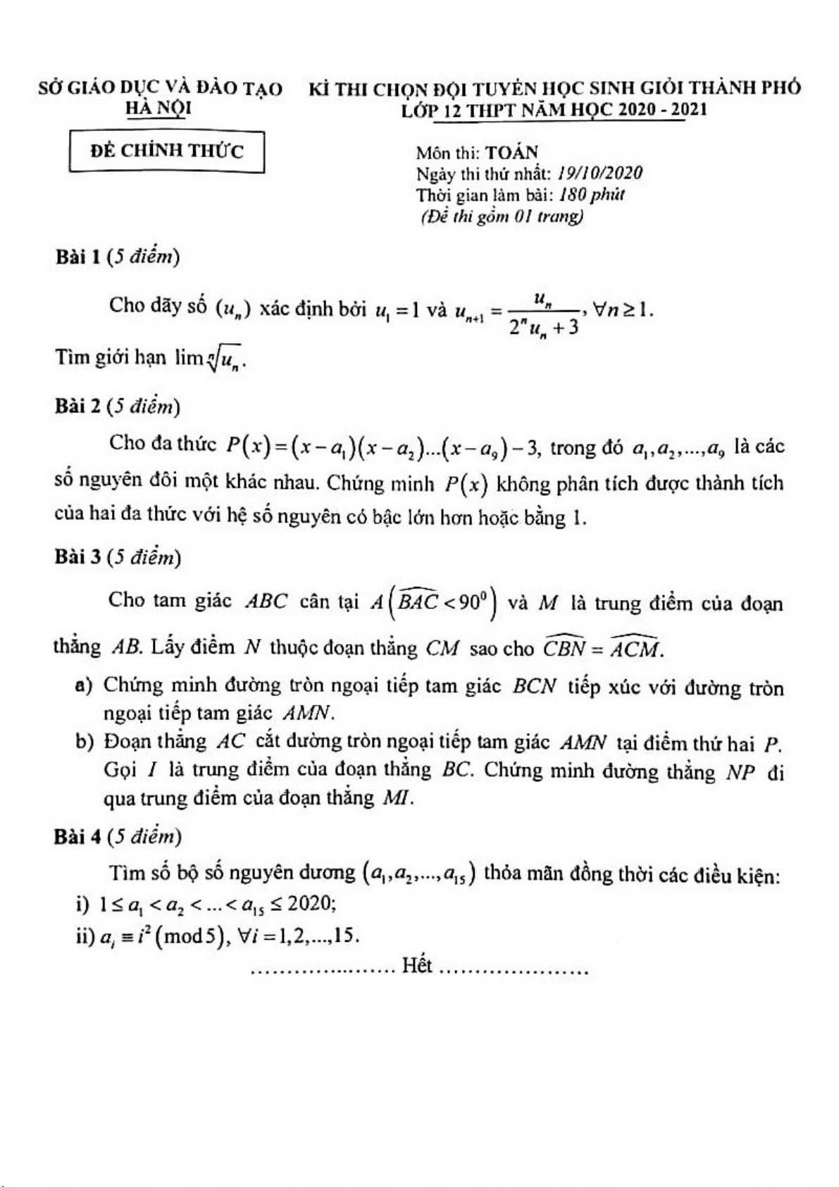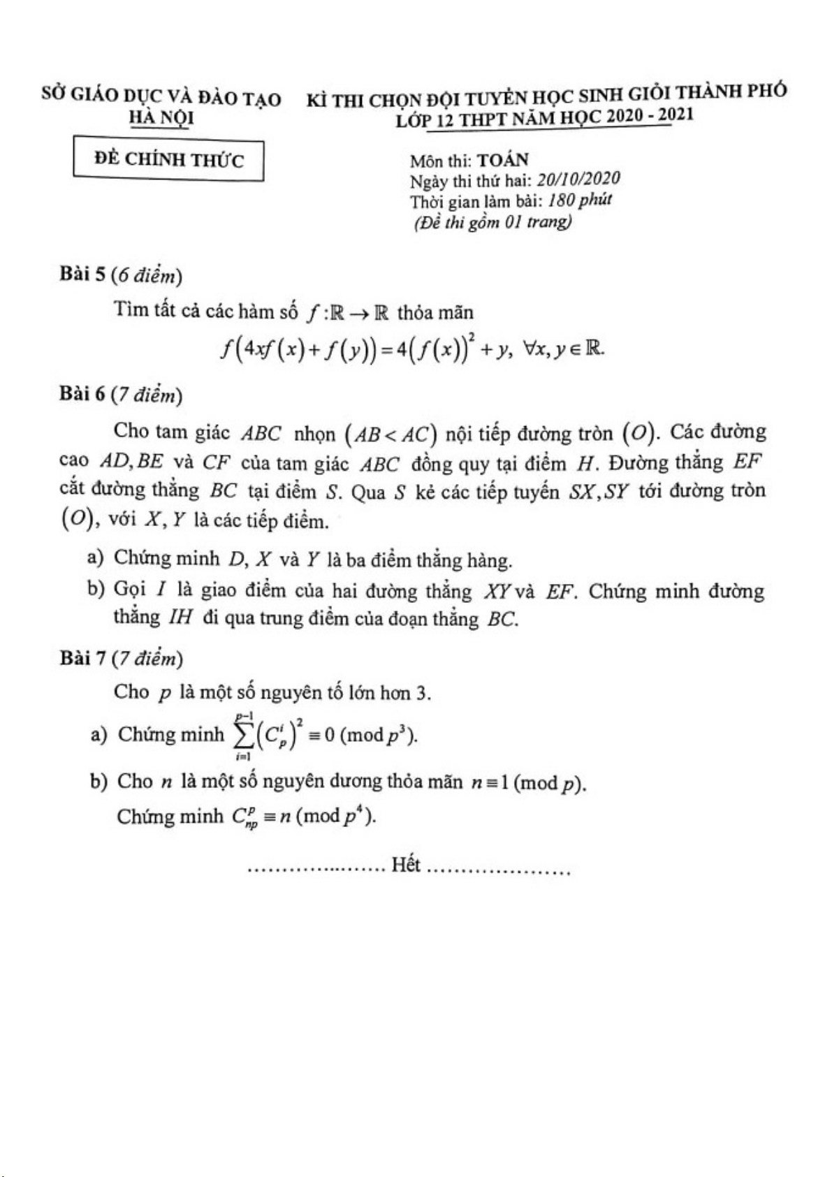 2. Đề thi học sinh giỏi môn Toán lớp 12 cấp Thành phố năm 2020-2021 - Sở GD&ĐT Hà