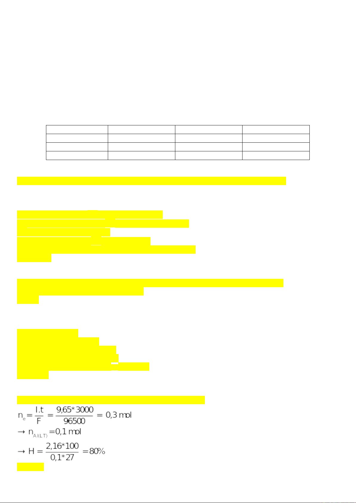 3000 giây, thu được 2,16 gam Al. Hiệu suất của phản ứng là bao nhiêu ?