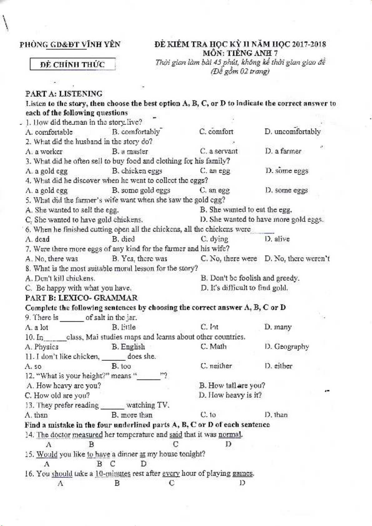 1. Đề thi học kì 2 Tiếng Anh 7 năm 2017-2018 có đáp án - Phòng