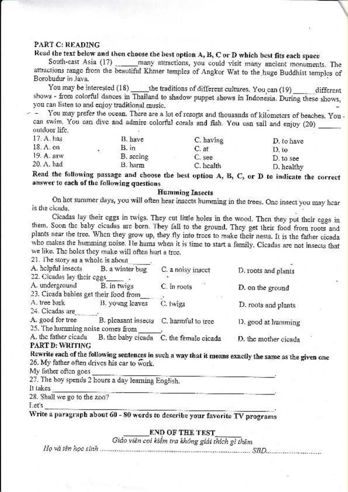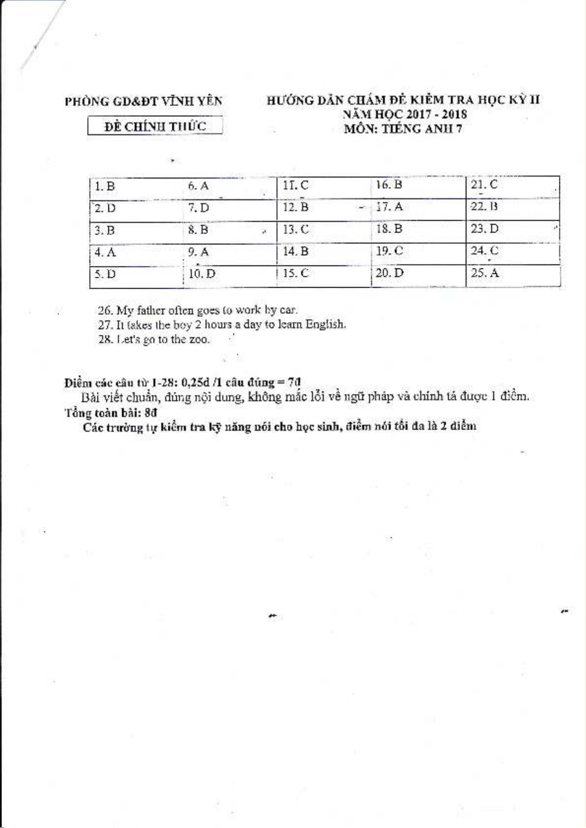 9. Đề thi học kì 2 Tiếng Anh 7 năm 2017-2018 có đáp án - Trường
