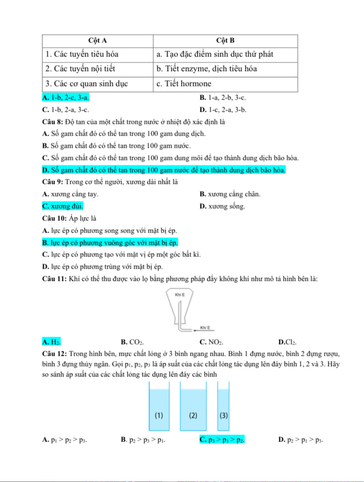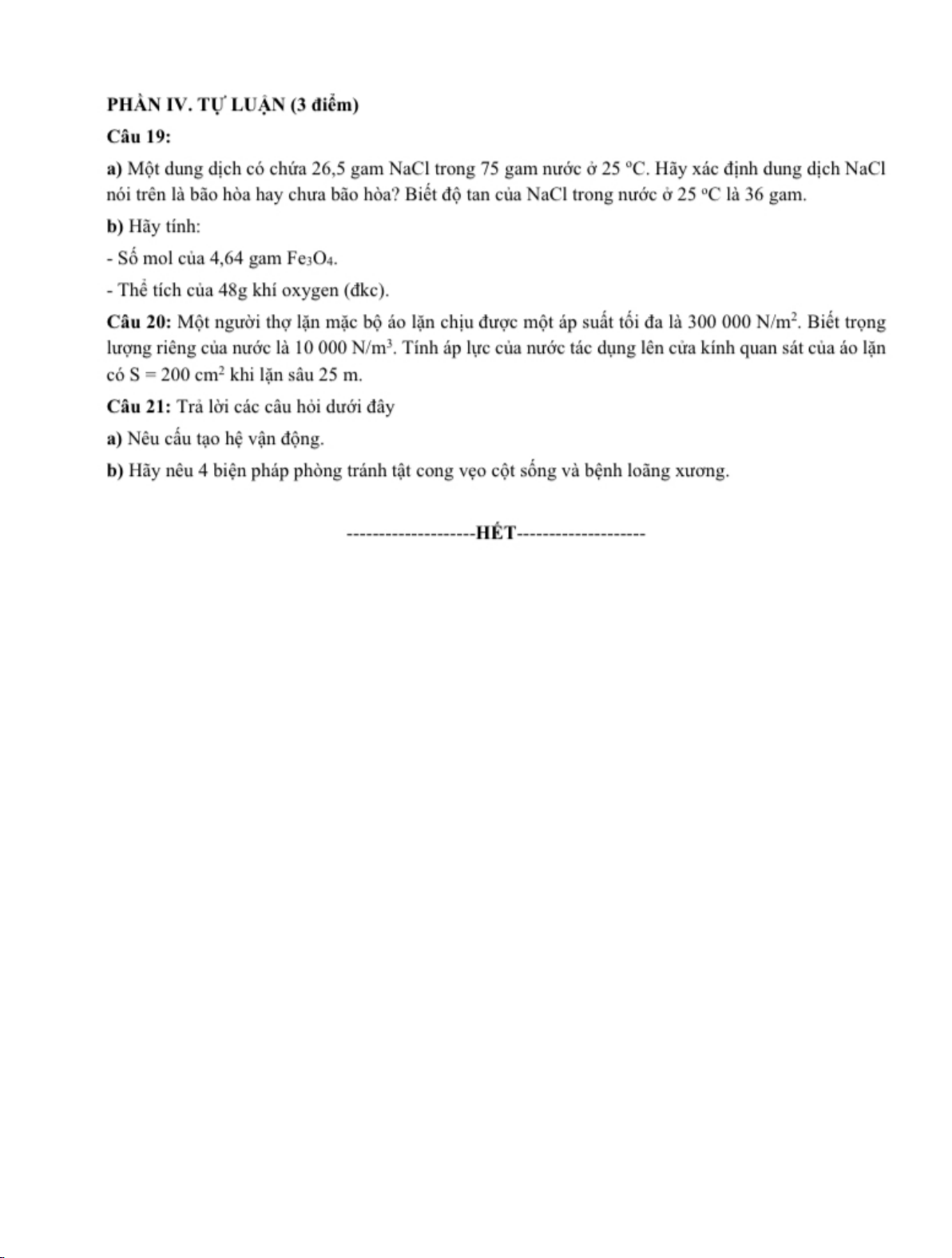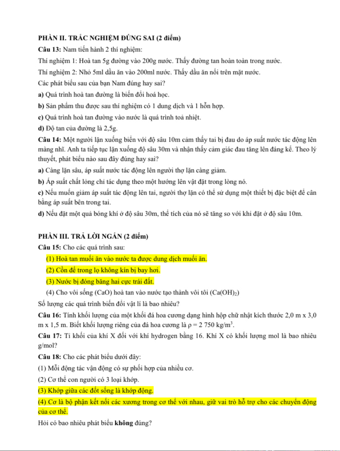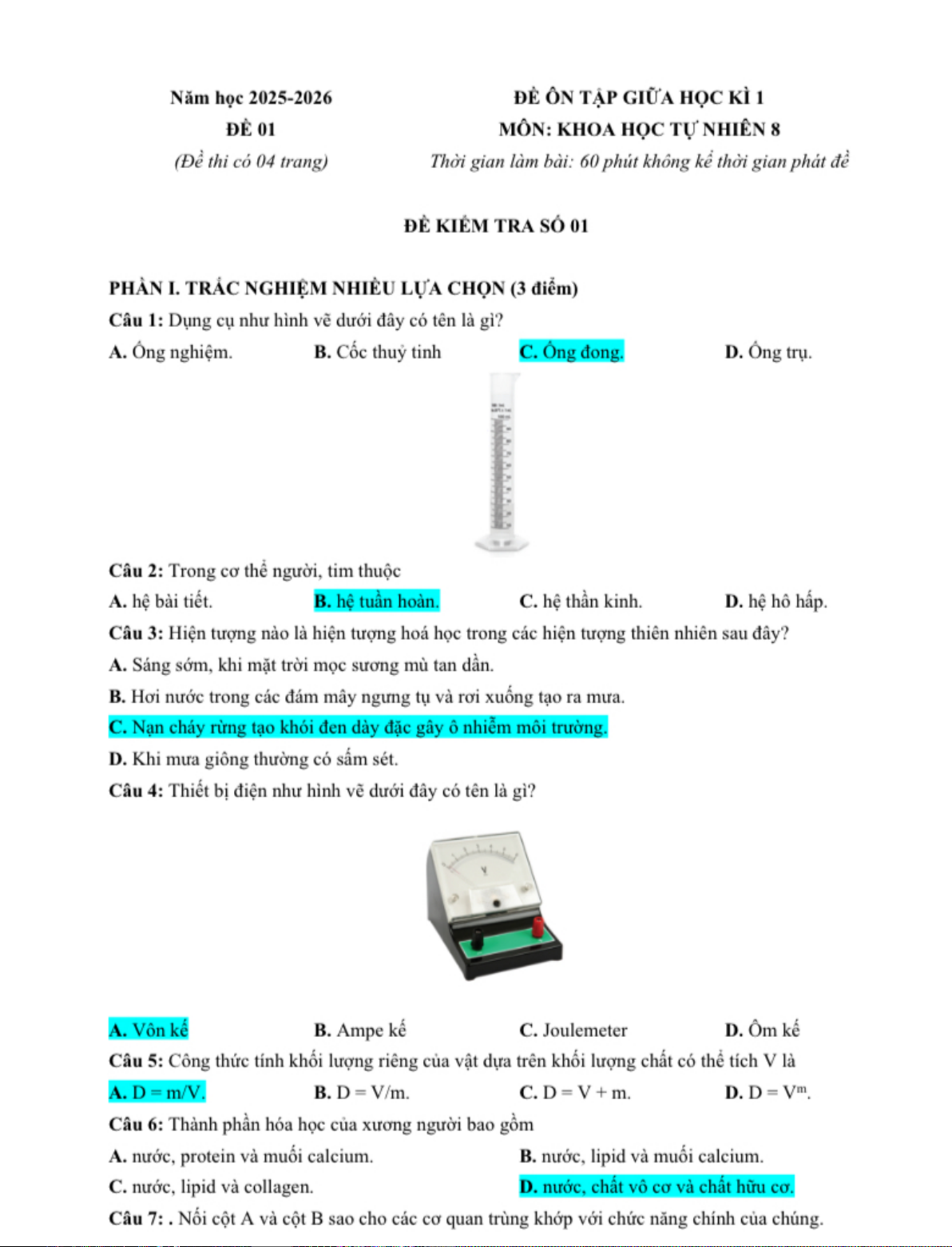 Tài liệu này cung cấp một đề kiểm tra tổng hợp môn Khoa học tự nhiên lớp 8, được thiết kế để ôn tập giữa học kì 1 cho năm học 2025-2026, với thời gian làm bài 60 phút. Đề thi bao gồm ba phần chính: trắc nghiệm nhiều lựa chọn, trắc nghiệm đúng sai và tự luận, mỗi phần có phân bổ điểm rõ ràng. Các câu hỏi trắc nghiệm nhiều lựa chọn và đúng sai tập trung vào việc kiểm tra kiến thức cơ bản về các dụng cụ đo lường (ống đong, ampe kế), hệ cơ quan trong cơ thể người (hệ tuần hoàn, hệ bài tiết), hiện tượng hóa học và vật lý trong tự nhiên (ô nhiễm môi trường, tan chảy, sấm sét), công thức tính toán (khối lượng riêng, áp suất), cấu tạo cơ thể người (xương, khớp) và tính chất vật lý của chất (độ tan, khối lượng mol). Phần tự luận đòi hỏi học sinh vận dụng kiến thức để giải các bài toán hóa học (độ tan, tính số mol, thể tích khí), vật lý (áp suất, lực ép) và sinh học (cấu tạo hệ vận động, các biện pháp phòng tránh bệnh cong vẹo cột sống và loãng xương). Nội dung đề cập đến nhiều khía cạnh quan trọng của chương trình, giúp học sinh củng cố và kiểm tra năng lực toàn diện.