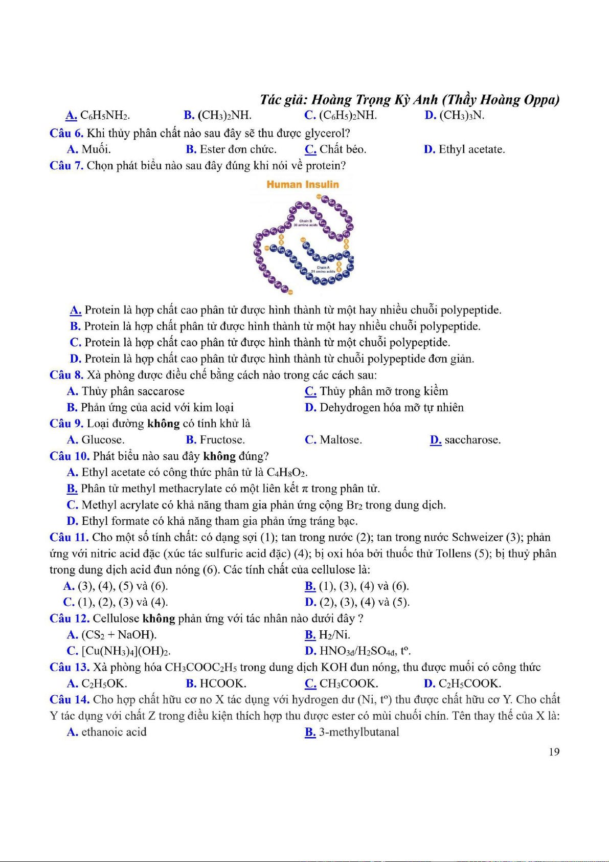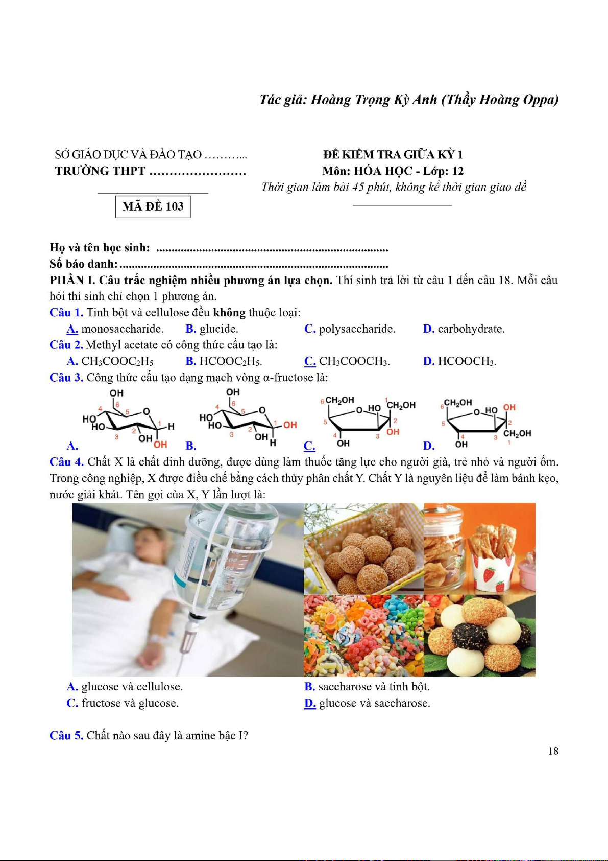 Bộ đề kiểm tra Hóa học lớp 12 giữa kỳ 1 bao gồm trắc nghiệm và tự luận về carbohydrate, este, chất béo, protein, amine, amino acid, và ứng dụng thực tế.