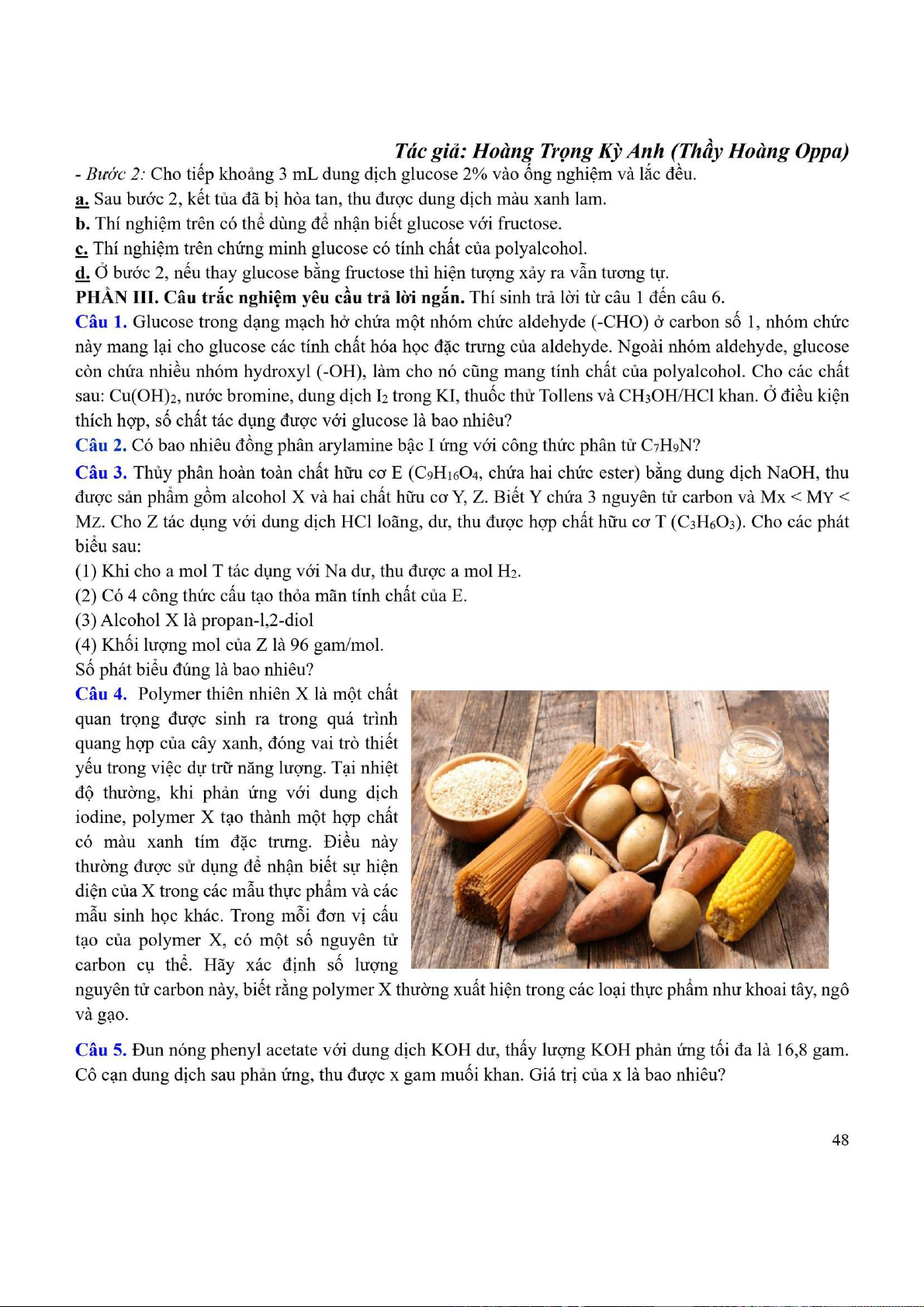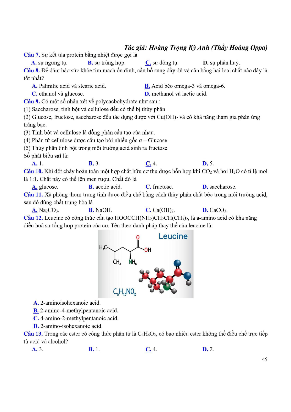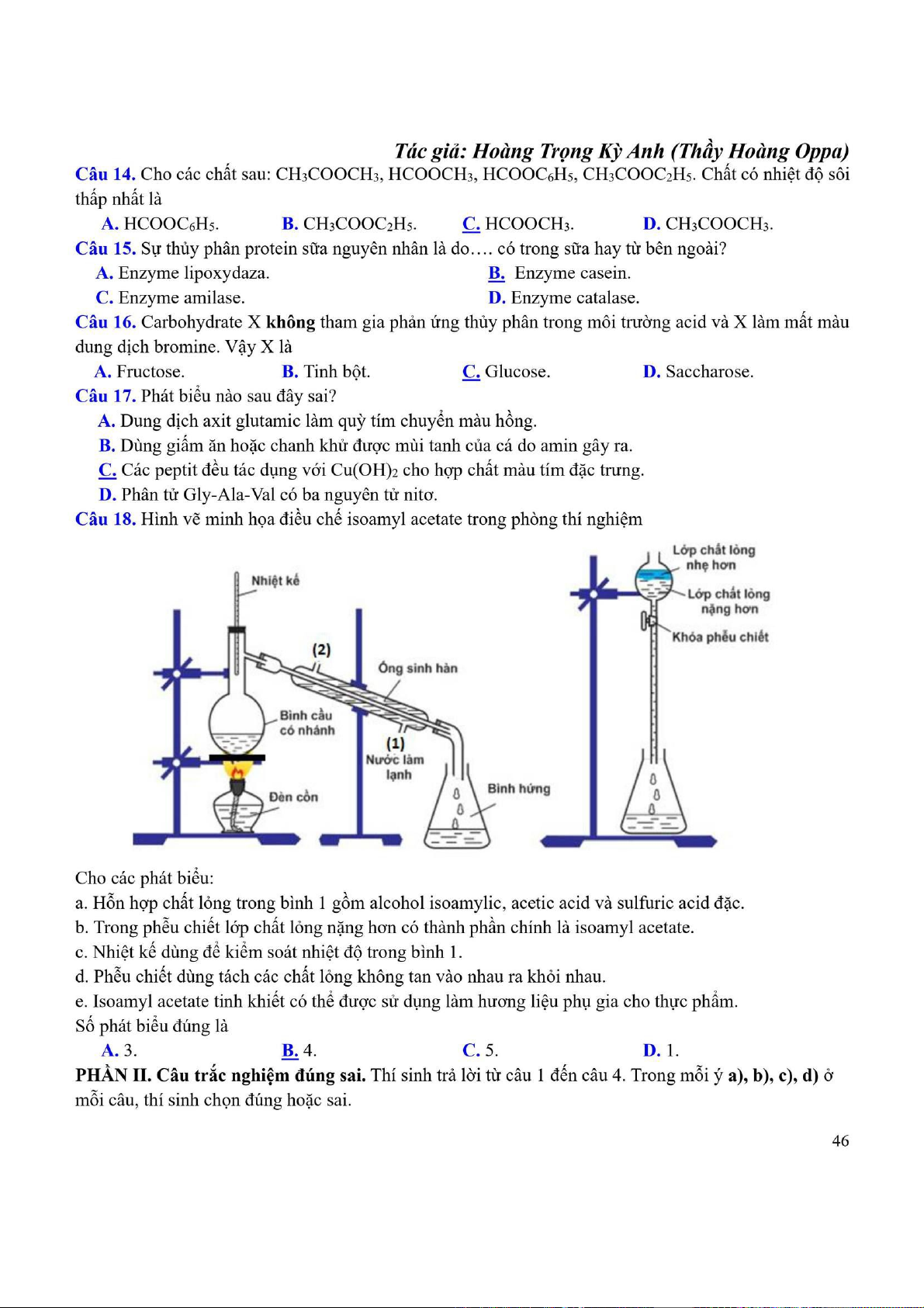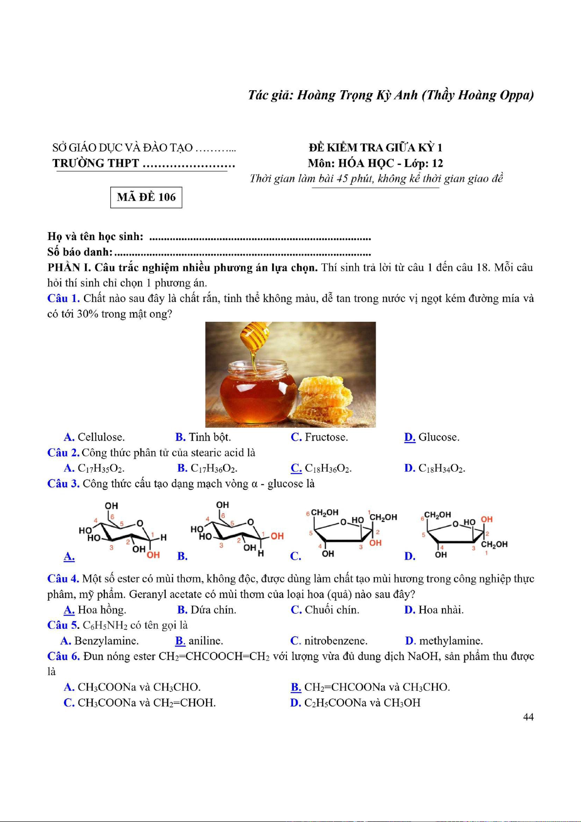 Bộ đề kiểm tra Hóa học lớp 12 giữa kỳ 1 bao gồm trắc nghiệm và tự luận về carbohydrate, este, chất béo, protein, amine, amino acid, và ứng dụng thực tế.