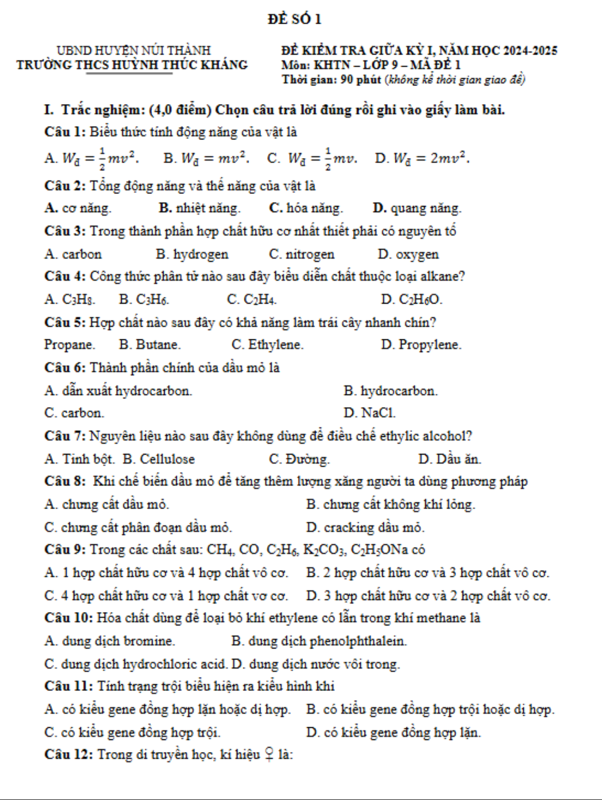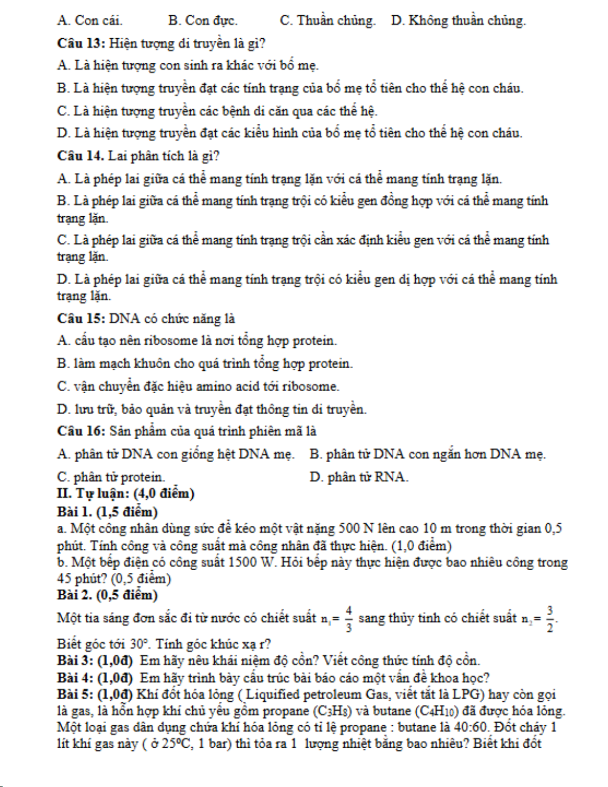 Đề kiểm tra giữa kỳ 1 môn KHTN lớp 9 đánh giá các kiến thức về động năng, thế năng, hợp chất hữu cơ, di truyền, công, quang học, DNA,... Các bài tập này giúp học sinh phát triển khả năng phân tích, tổng hợp, và giải quyết vấn đề một cách logic và chính xác.