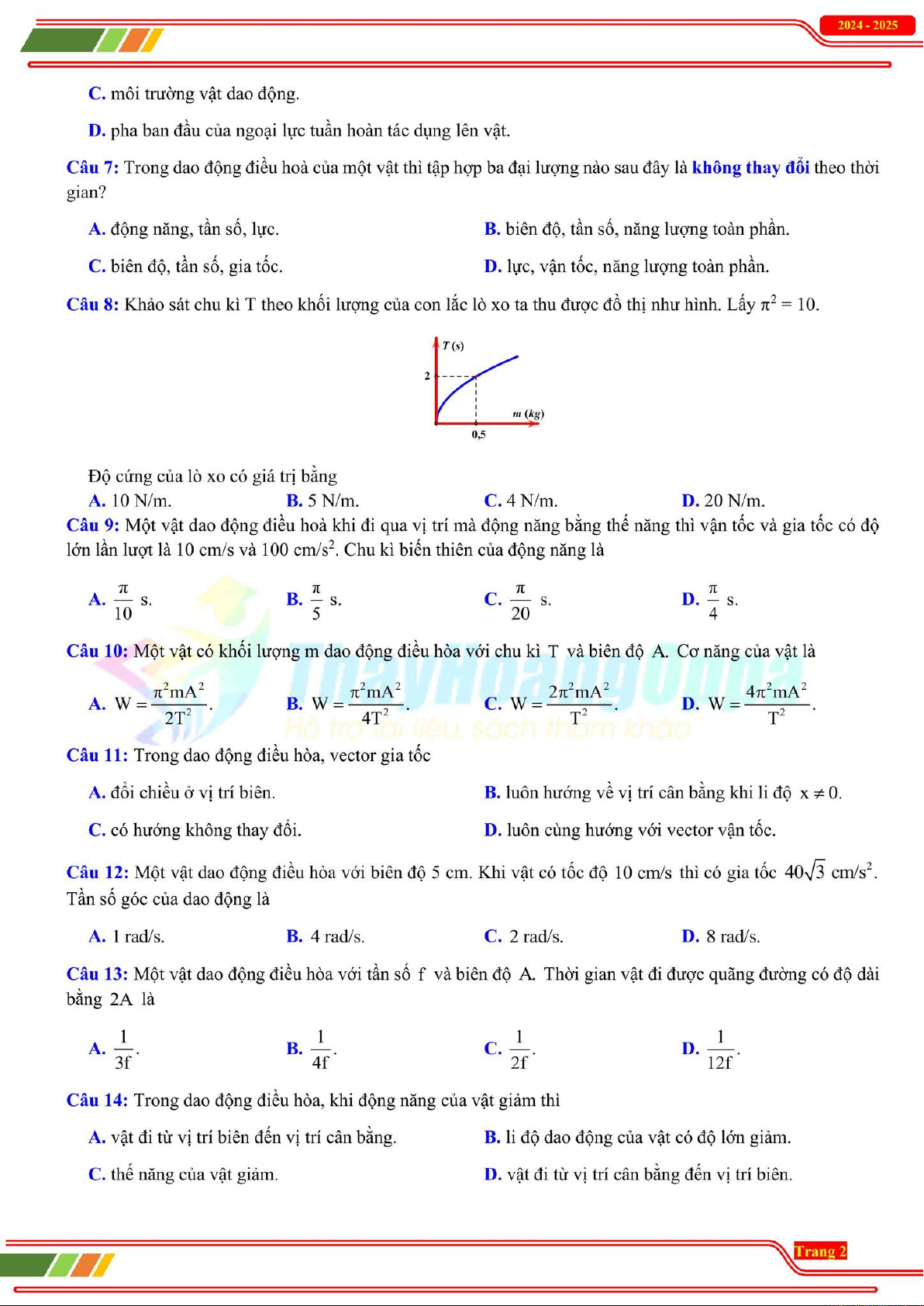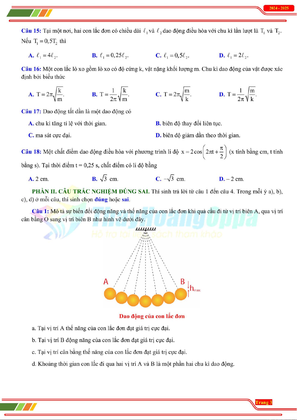 Bộ đề thi Vật lí 11 giữa kỳ 1 gồm trắc nghiệm, đúng sai, tự luận về dao động điều hòa, con lắc đơn/lò xo, giúp học sinh ôn luyện kiến thức.