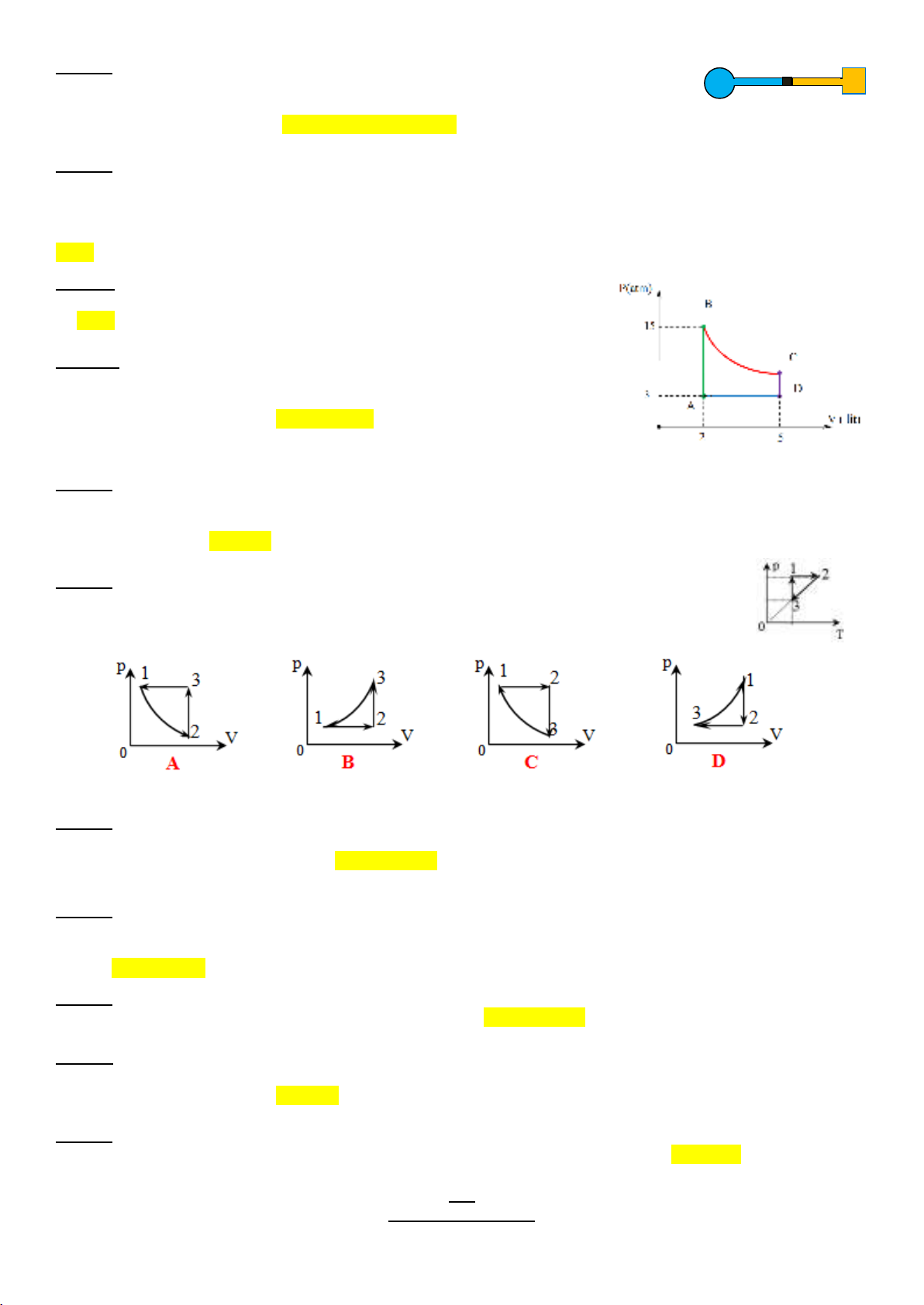 Câu 26: Một khối khí có thể tích 6 lít có nhiệt độ 200C, nén khối khí đến thể tích 4 lít thì nhiệt độ vẫn là 200C, áp suất
