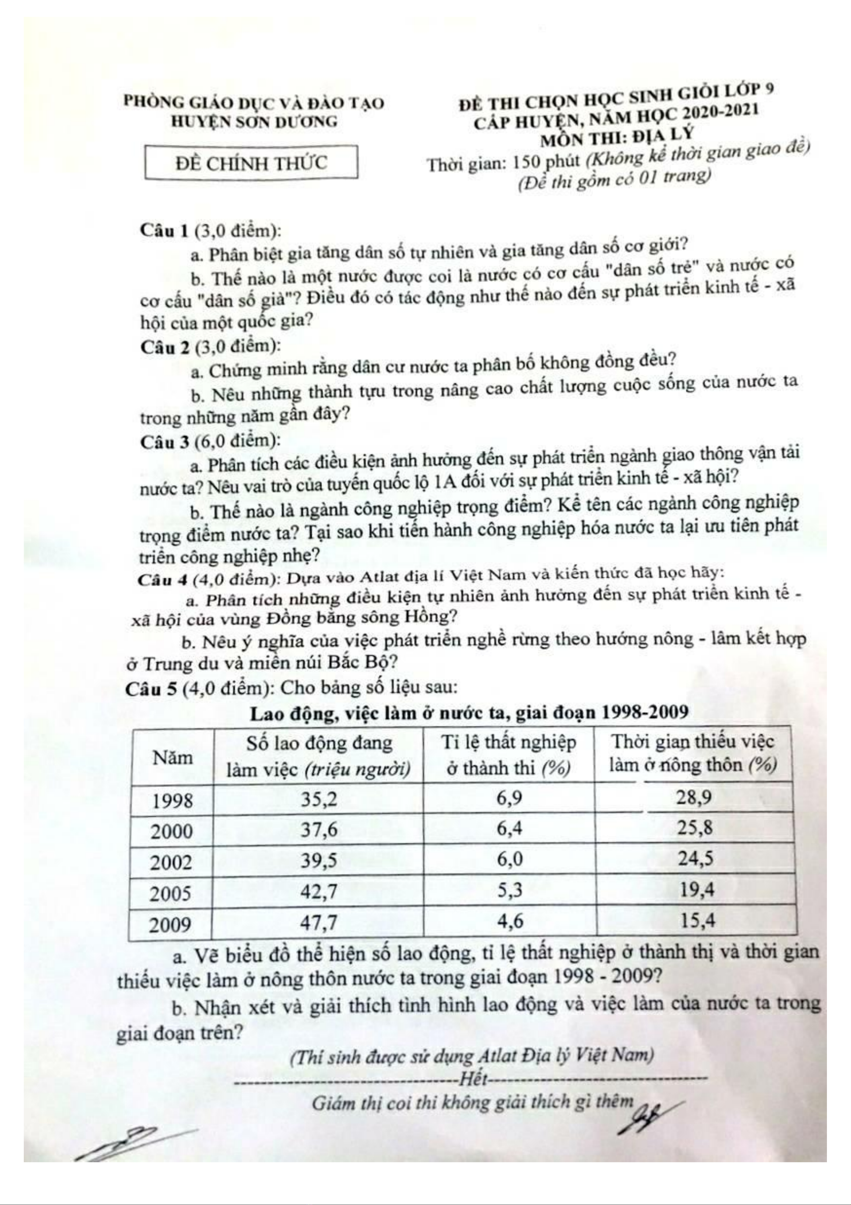 1. Đề thi học sinh giỏi môn Địa lí lớp 9 cấp huyện năm 2020-2021 - Phòng