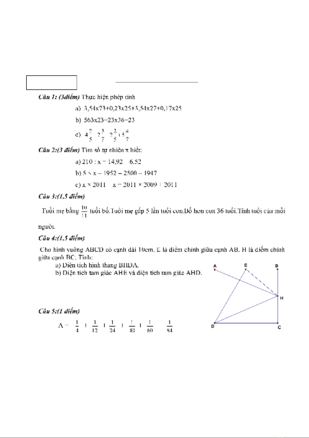 c/ Tính diện tích tam giác DEM, biết diện tích ABCD bằng 2010 cm