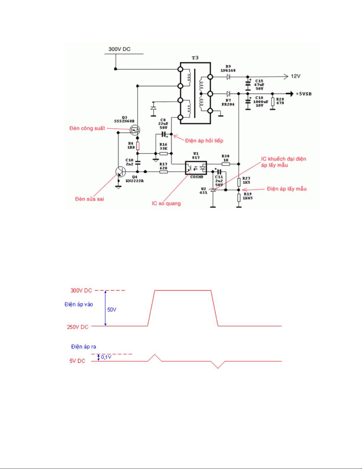 - Giả sử khi điện áp vào tăng lên, điện áp đầu ra có xu hướng tăng theo => điện áp 5VSB tăng nhẹ => thông