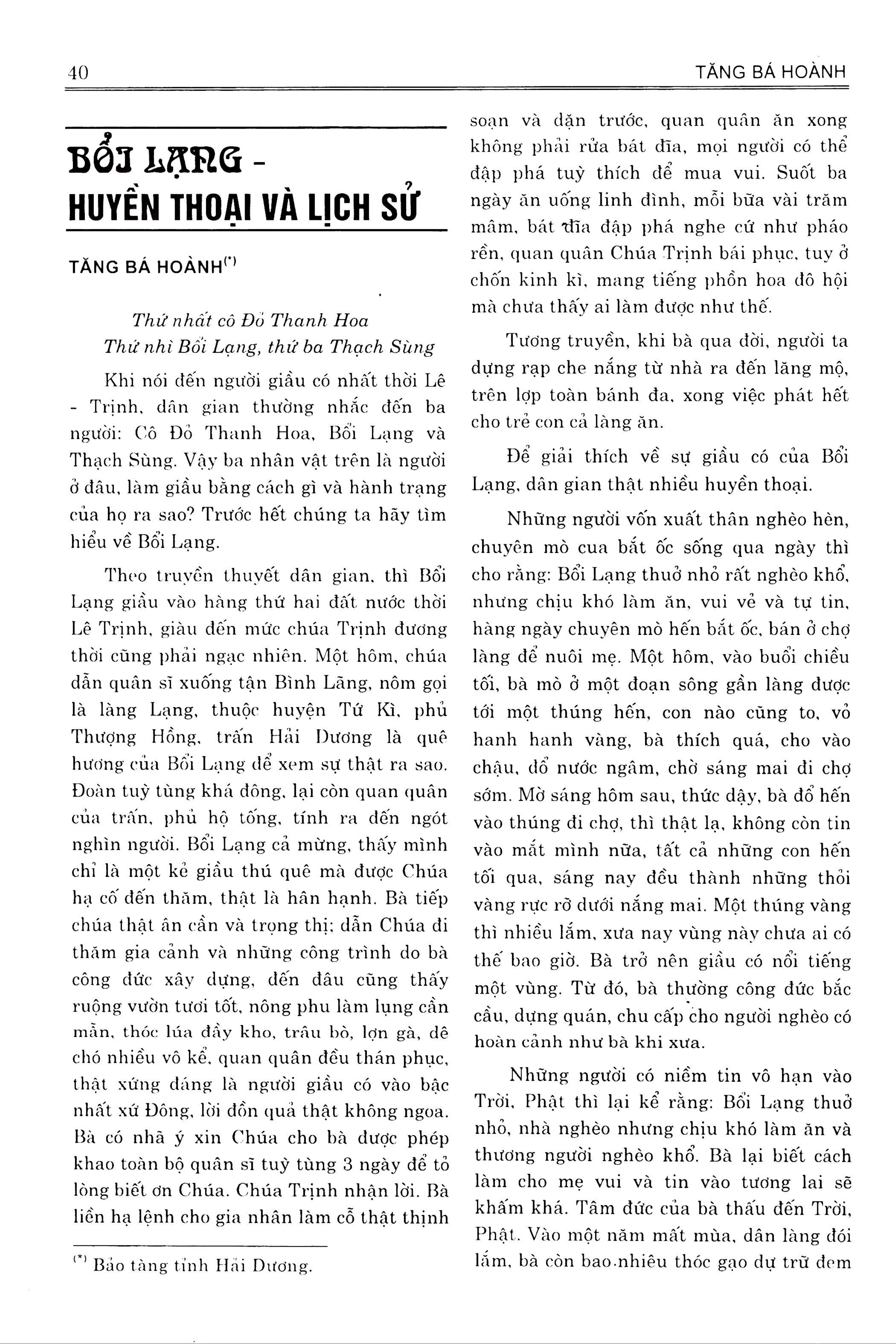 Tài liệu: Bổi Lạng - Huyền thoại và lịch sử là một tài liệu nghiên cứu về địa danh Bôi Lạng, gắn liền với huyền thoại phong phú và chứa đựng những trang sử đầy ý nghĩa. Bài viết khám phá mối liên hệ giữa huyền thoại và lịch sử tại Bôi Lạng, làm nổi bật vai trò của địa danh này trong việc hình thành bản sắc văn hóa và tâm linh cộng đồng. Tài liệu phân tích các câu chuyện về Bôi Lạng mang màu sắc huyền bí, phản ánh tâm tư và niềm tin người dân đối với các thế lực siêu nhiên, và vai trò của địa danh này trong việc hình thành bản sắc văn hóa và tâm linh cộng đồng.