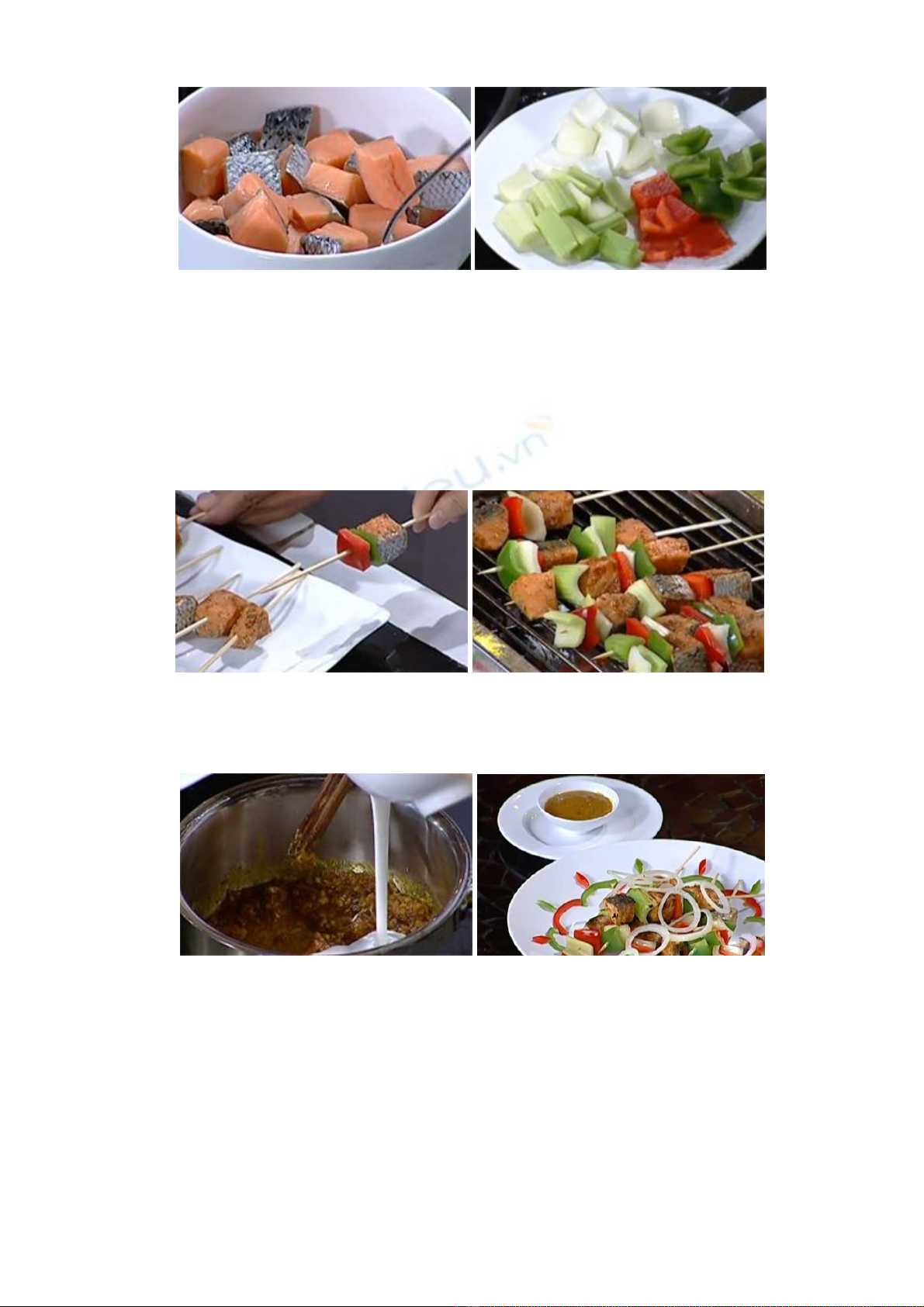 - Cá hồi cắt khối vuông, ướp với 2 thìa cà phê dầu ăn, 1 thìa cà phê bột tỏi, 2 thìa cà phê