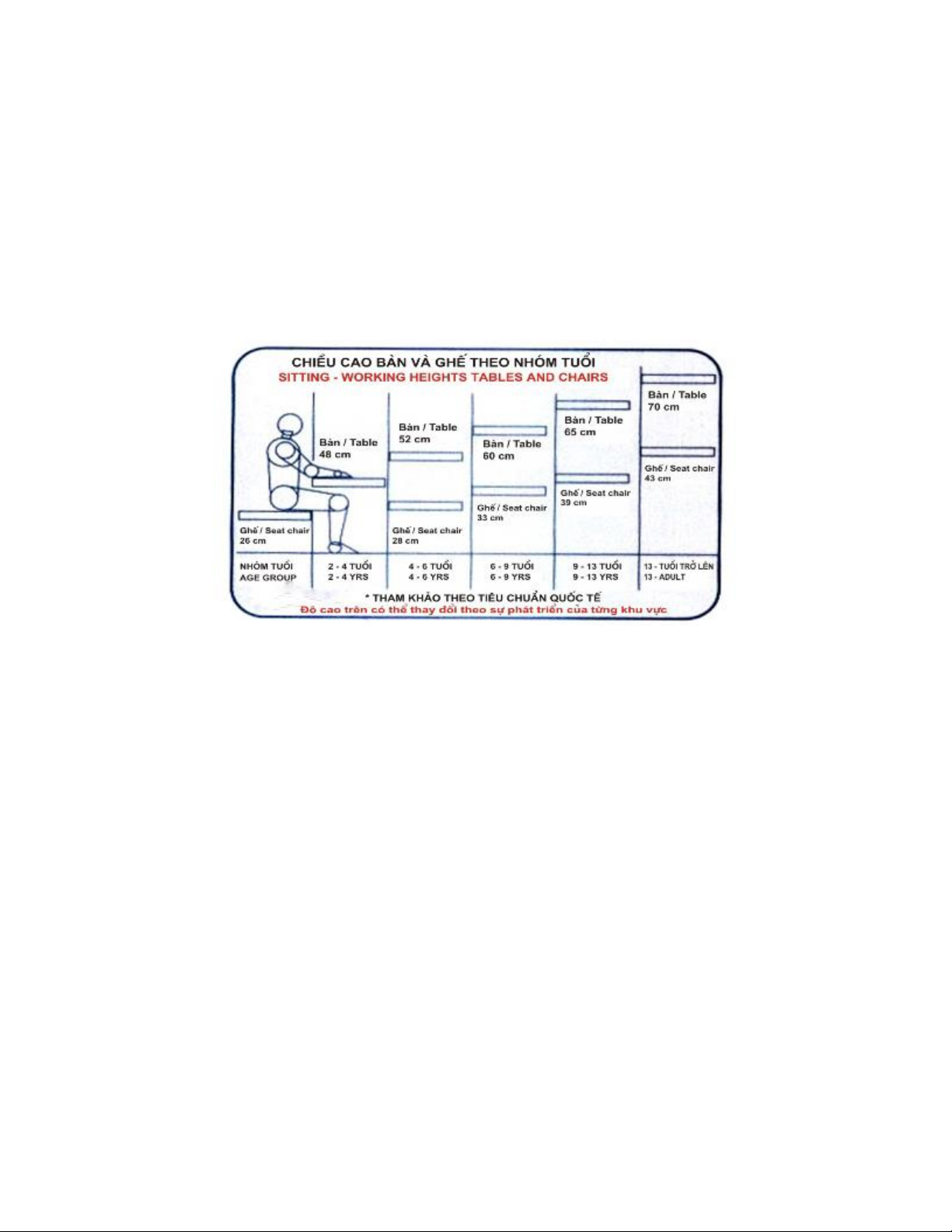 Bảng kích thước chiều cao bàn, ghế phù hợp với từng độ tuổi của bé