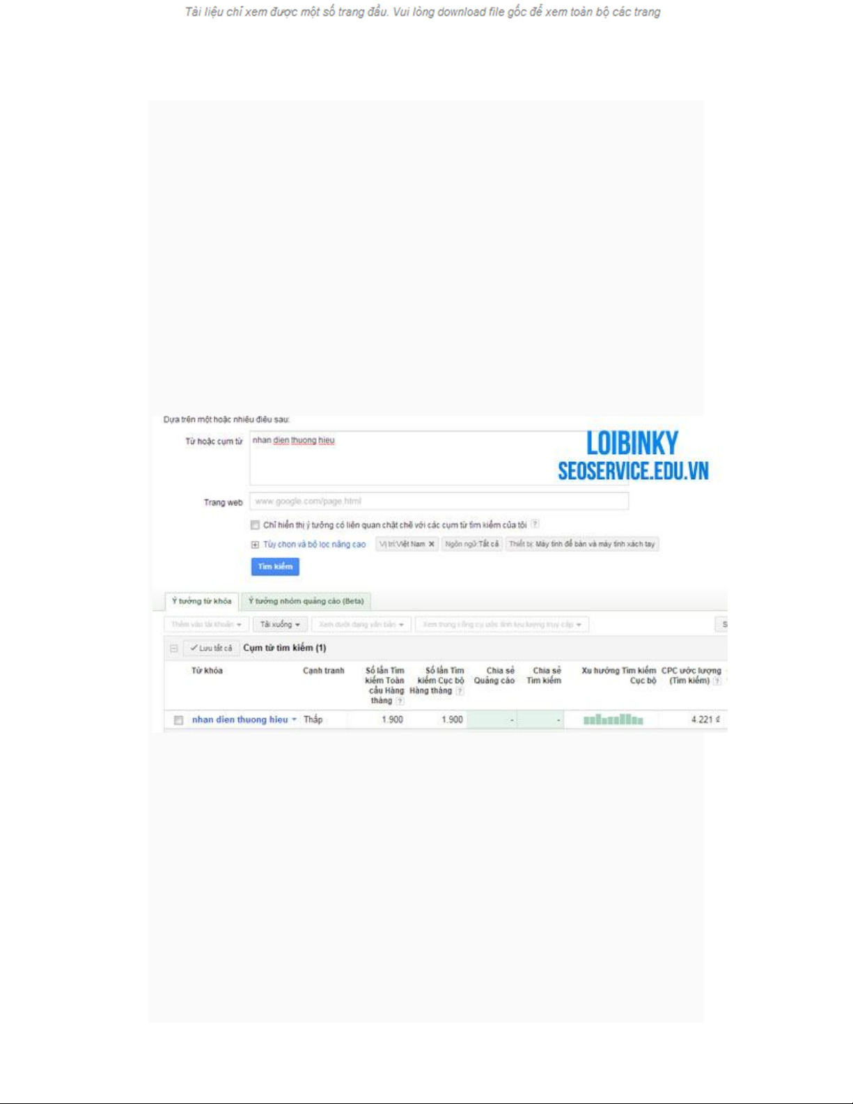 Vi dụ: cách tính giá seo từ khóa: nhan dien thuong hieu