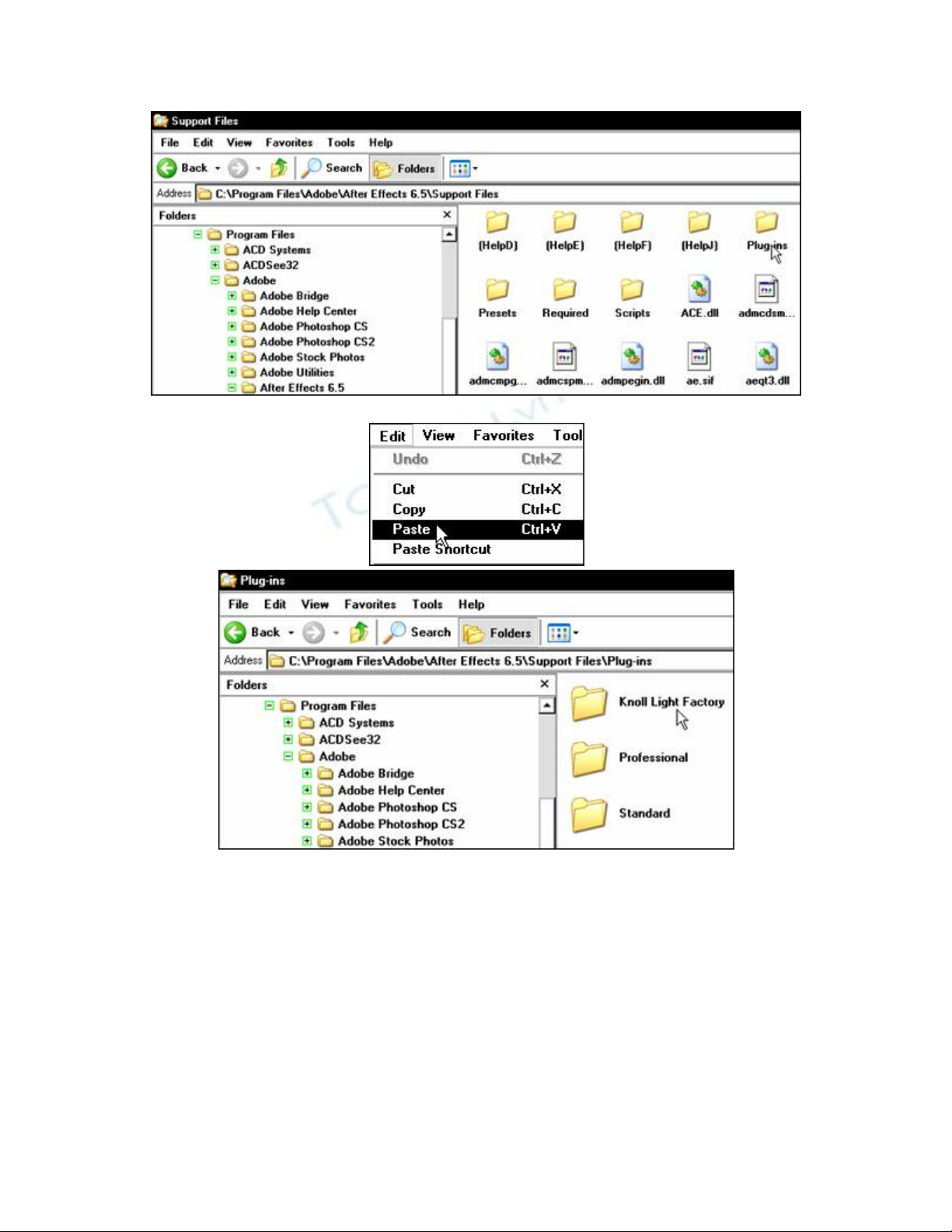 Trên trình đơn, chọn lệnh File > Pase dán thư mục Knoll Light Factory vào thư mục Plug-ins.