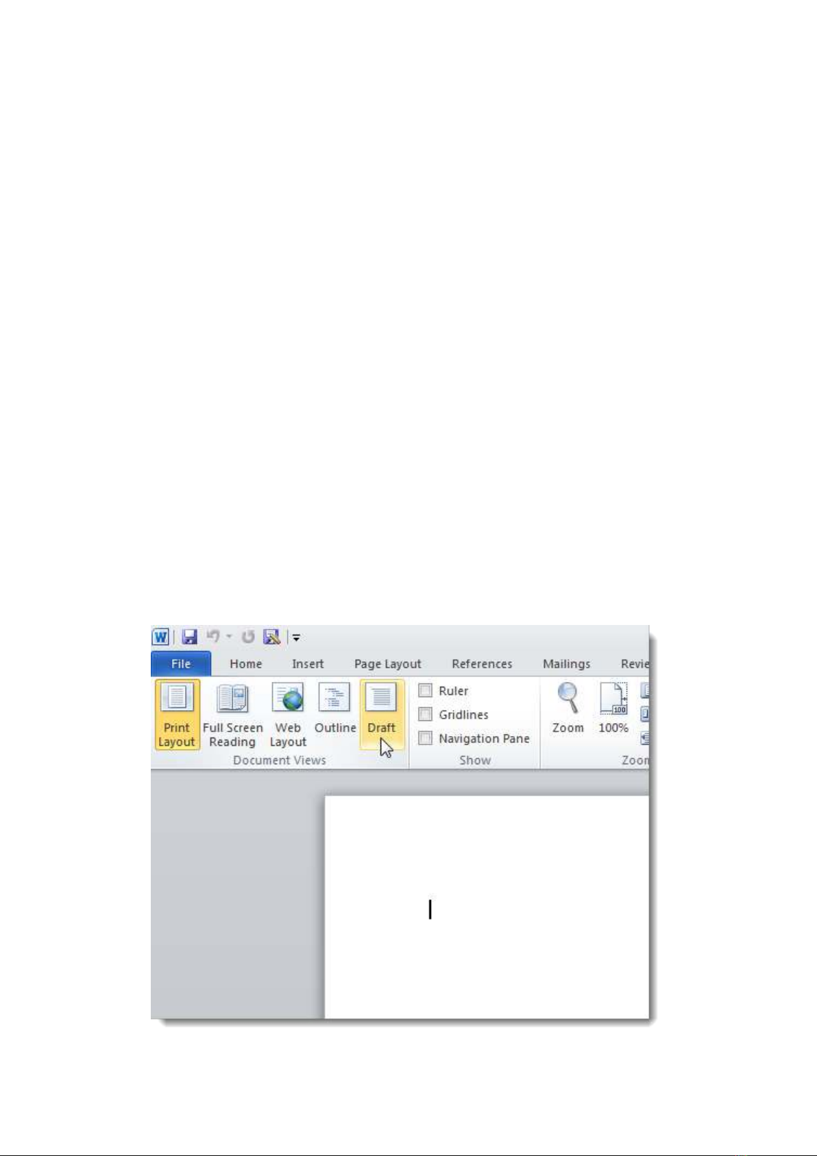 bấm vào tab View rồi chọn Draft trong phần Document Views.
