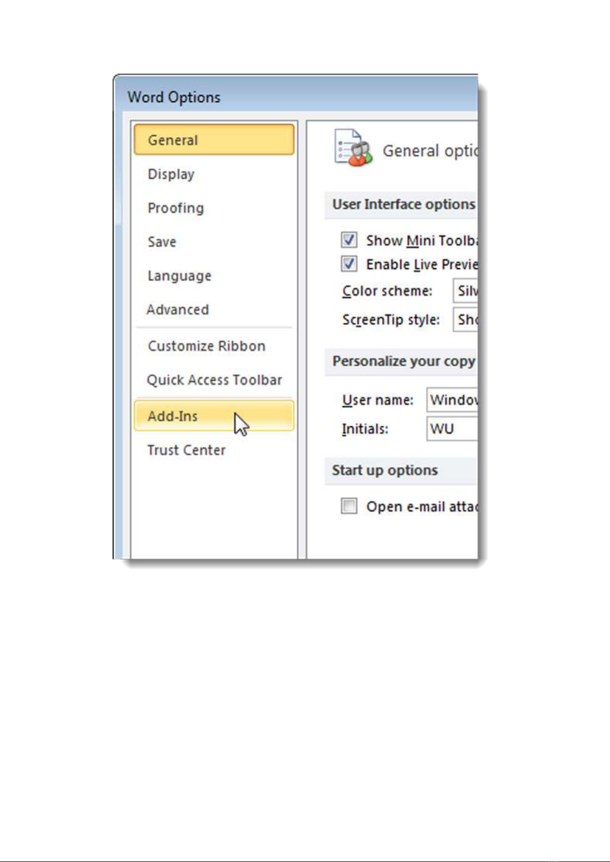 chọn Add-Ins ở menu bên trái. Đối với Word 2007, bạn hãy bấm nút Microsoft Office