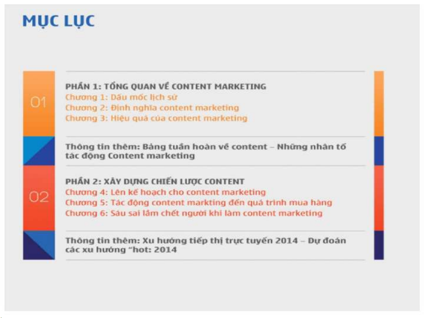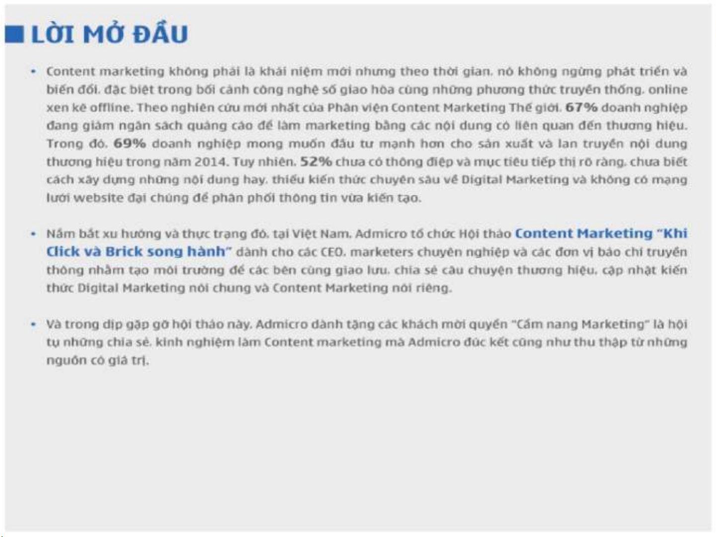 Tài liệu Cẩm nang Content Marketing sẽ giúp bạn có cái nhìn cơ bản và đúng đắn về Content Marketing. Những chiến lược và xu thế của Content Marketing 2014 - 2015 như thế nào.Mời các bạn tham khảo tài liệu để bổ sung thêm kiến thức về lĩnh vực này. Với các bạn chuyên ngành Marketing thì đây là tài liệu hữu ích.