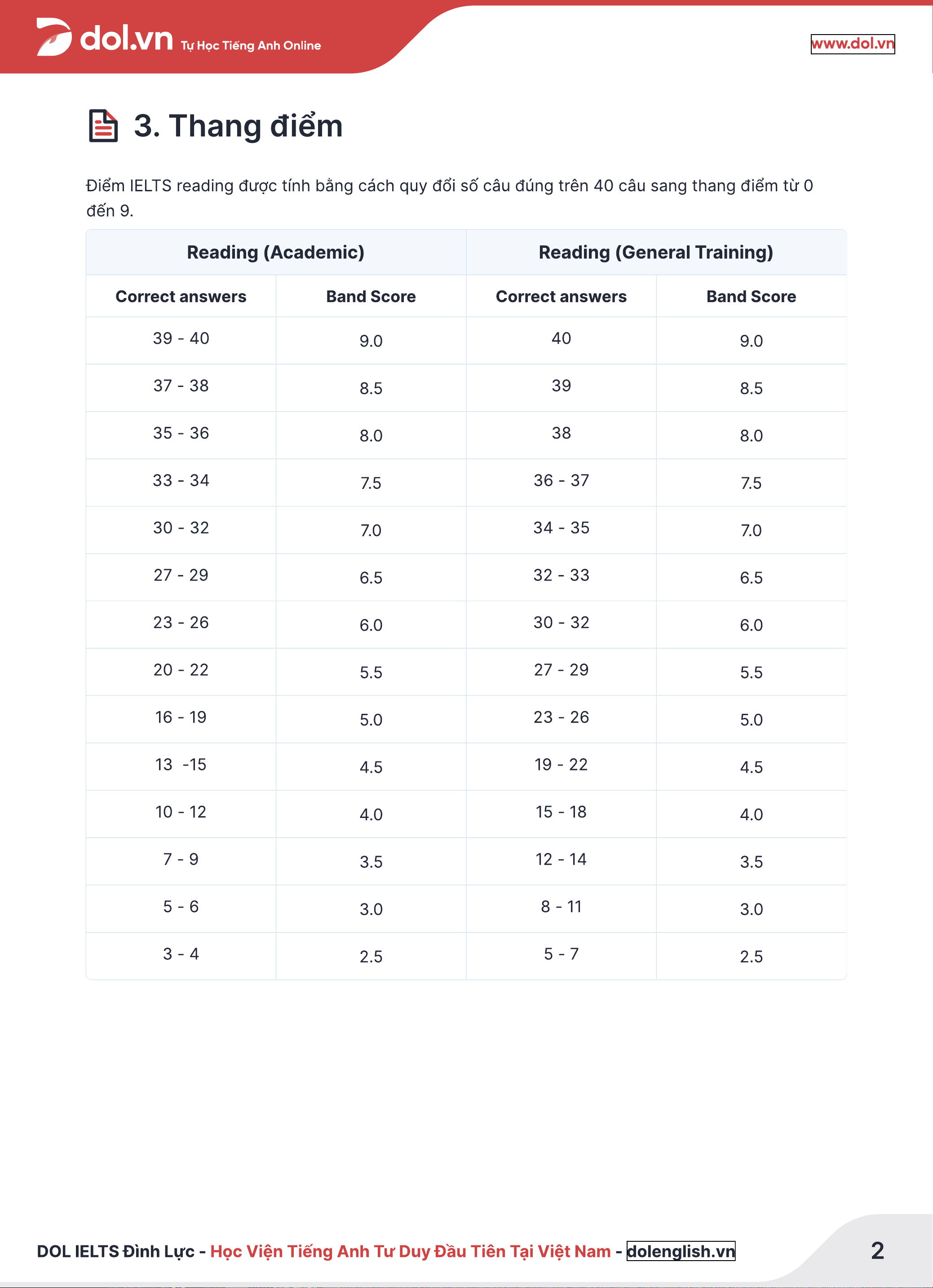 Điểm IELTS reading được tính bằng cách quy đổi số câu đúng trên 40 câu sang thang điểm từ 0