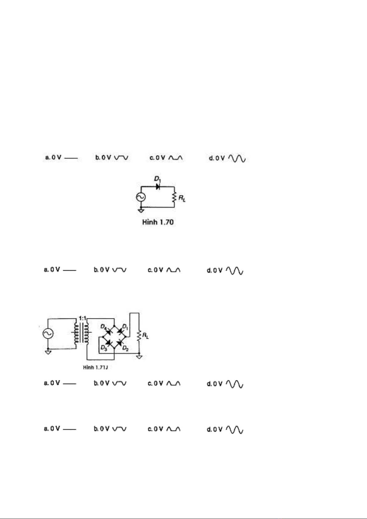 24. Mạch hình 1.71, có tín hiệu vào là sóng sin. Diode D1 hở mạch. Dạng sóng ra là . . . . .