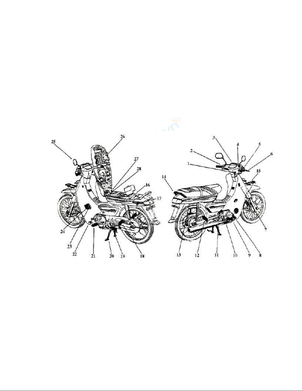 23. Khoá xăng 24. Lọc xăng 25. Kính chiếu hậu 26. Yên xe 27. Cao su