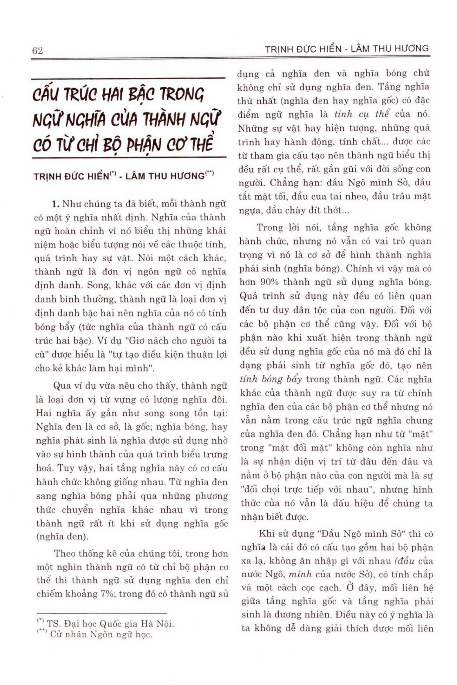 Tài liệu nghiên cứu 'Cấu trúc hai bậc trong ngữ nghĩa của thành ngữ có từ chỉ bộ phận cơ thể' giới thiệu và phân tích các thành ngữ biểu cảm, hình ảnh trong ngôn ngữ Việt Nam. Chúng ta sẽ tìm hiểu nghĩa đen và nghĩa bóng của các thành ngữ, cũng như cách chúng ta có thể sử dụng trong giao tiếp hàng ngày. Qua đánh giá cấu trúc ngữ nghĩa của các thành ngữ này, tài liệu này cung cấp một cái nhìn vào cách con người diễn đạt cảm xúc và tư duy, cũng như quan hệ xã hội trong Việt Nam. Tài liệu này khuyên đọc viết lý thì sự phân tích ngữ nghĩa và biểu diễn của con người, cũng như quan hệ xã hội đang thay đổi trong mọi thời gian.